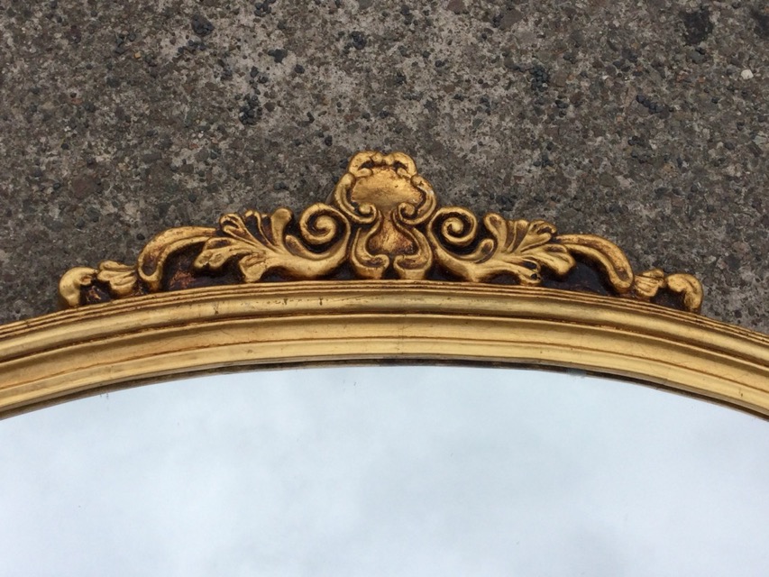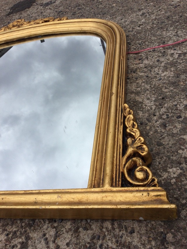 A Victorian style gilt overmantle mirror with arch shaped plate in moulded frame surmounted by a scrolled crest, raised on moulded plinth with conforming scrolled mounts. (47in x 36in ext)