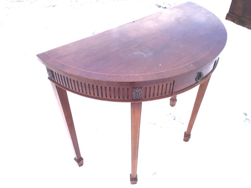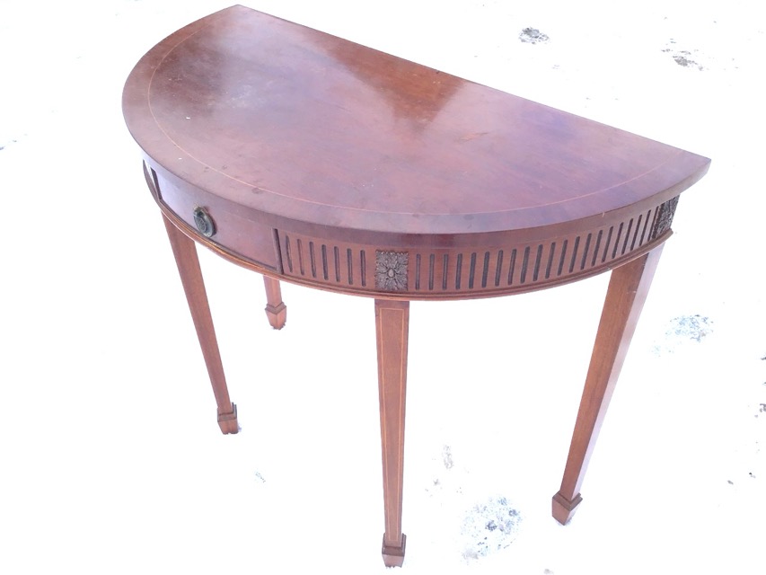 A reproduction mahogany D-shaped hall table, the crossbanded top inlaid with boxwood stringing above a ribbed frieze and central cockbeaded drawer, raised on square tapering legs with spade feet. (35.5in x 17.75in x 30.5in)