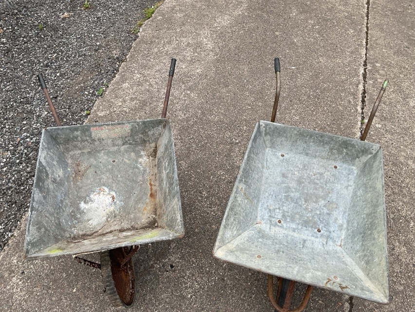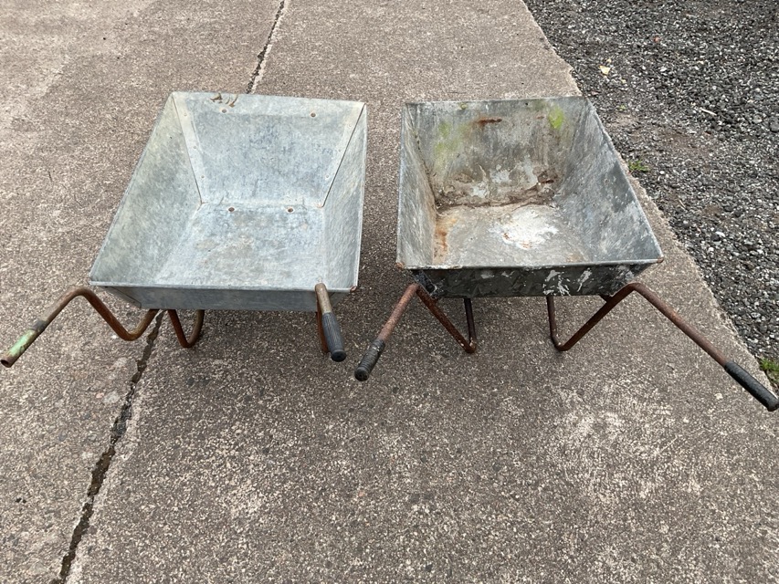 Two galvanised wheel barrows with angled sides and rolled rims. (2)