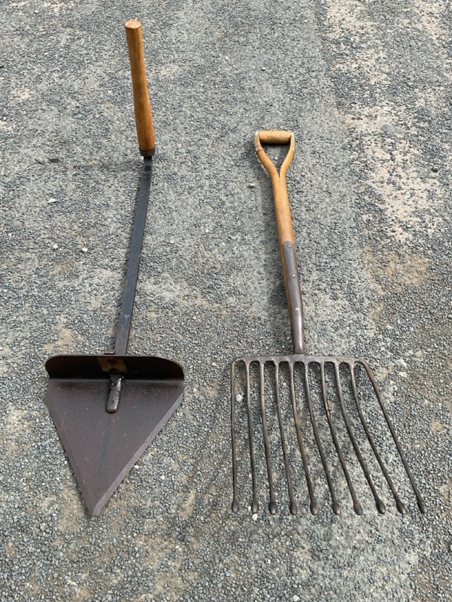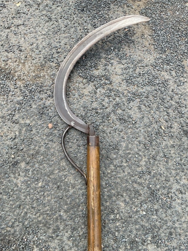 A pronged potatoe shovel with hardwood handle; a triangular bladed peat cutter with turned beech handle; and a billhook type scythe with Riley crescent shaped blade on wood shaft. (3)
