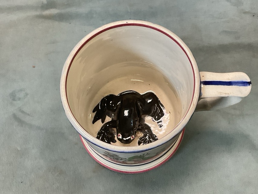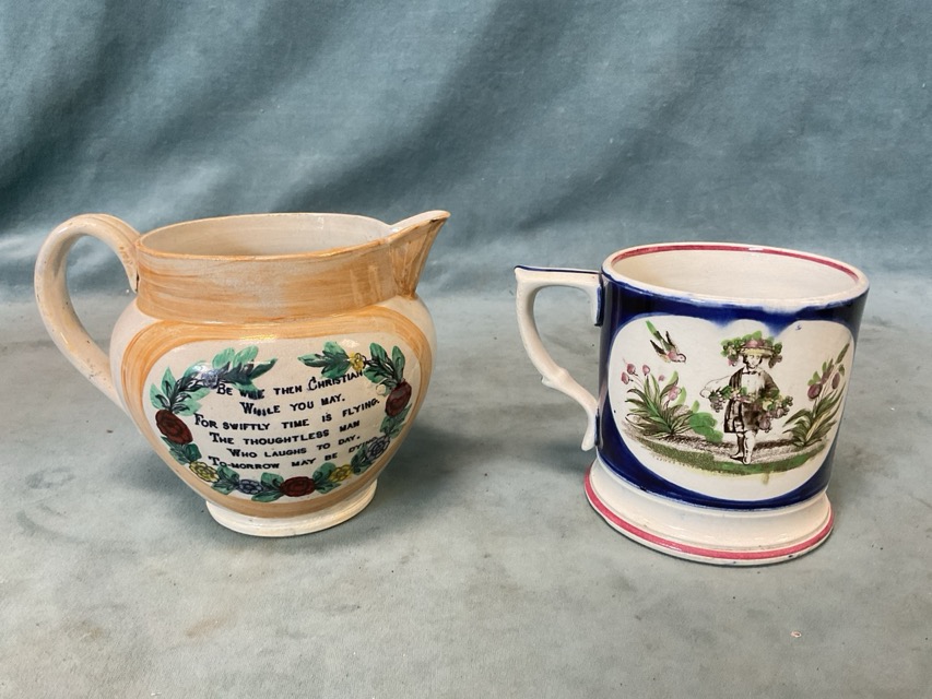 A Victorian Sunderland Moore-Scotts pottery orange lustre jug, with clipper ship and poem transfers; and a North East pottery frog mug with handcoloured transfer decoration of a woodsman and a grape harvester. (2)