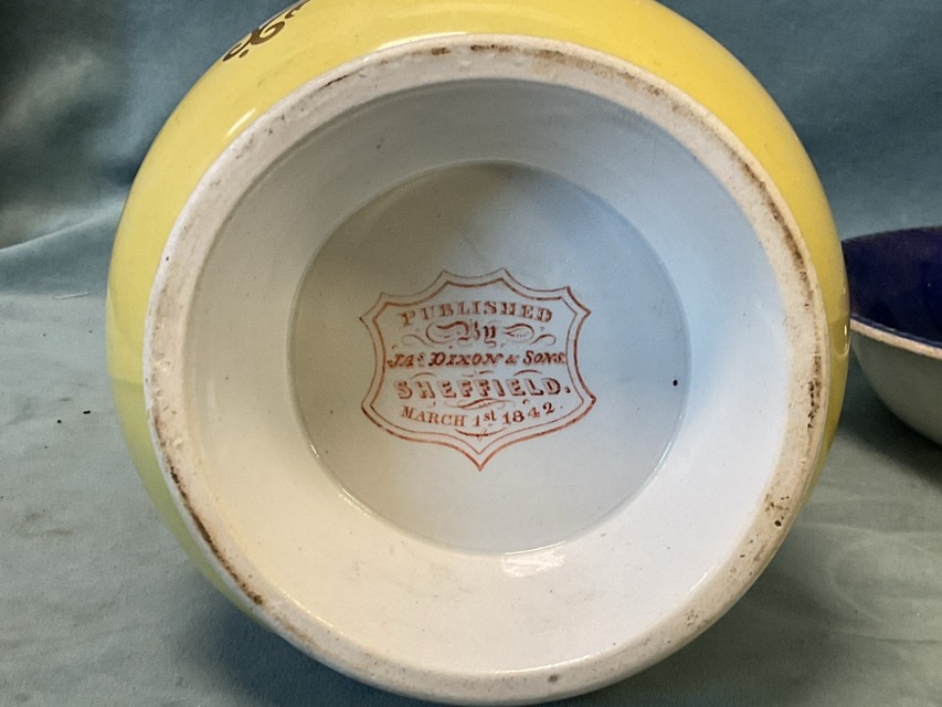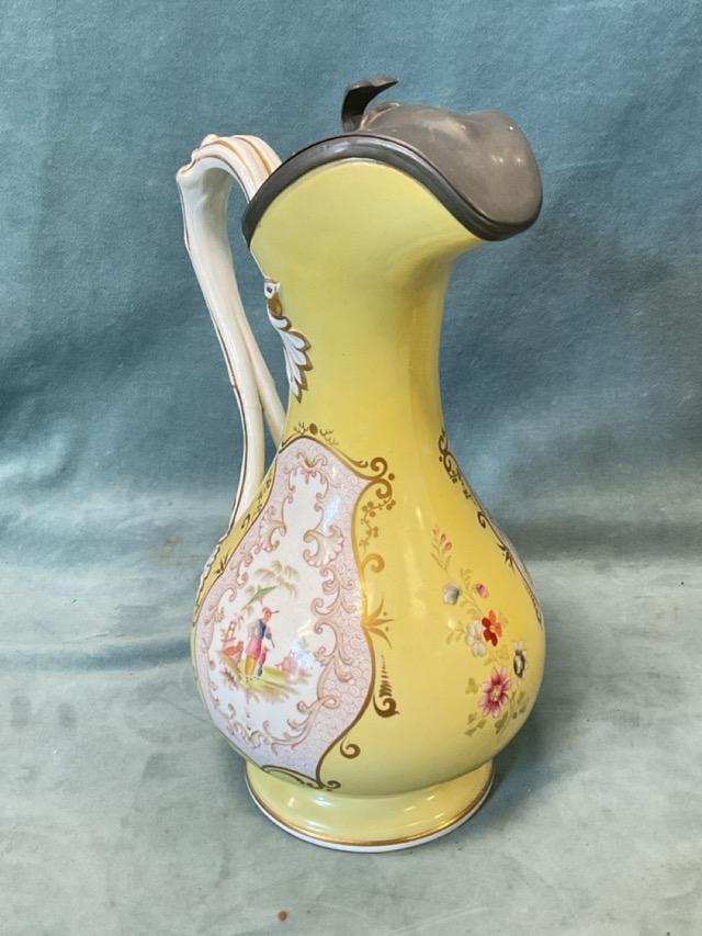 An 1842 Victorian Staffordshire ewer with handcoloured floral chinoiserie decoration on yellow ground, the pewter cover by James Dixon & Sons - dated. (12.5in)