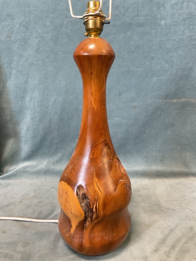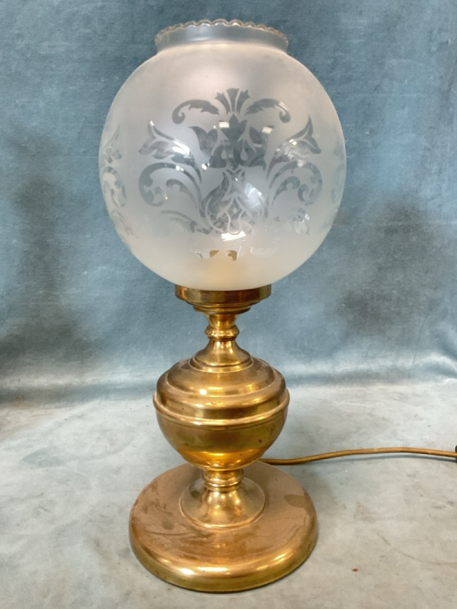 A contemporary turned yew mallet shaped tablelamp - 18in; and a brass tablelamp with foliate frosted glass globe on an oil lamp style circular base - 17in. (2)