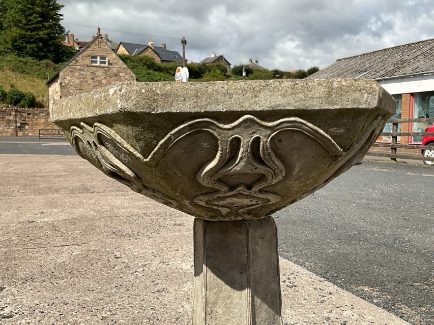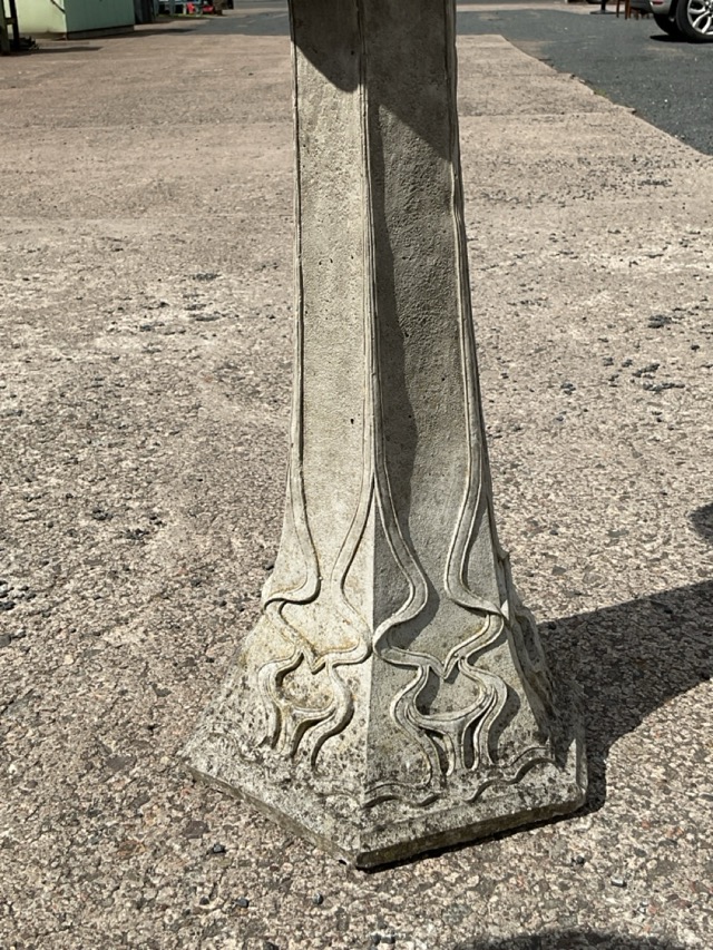 An art nouveau style composition stone garden birdbath, the hexagonal bowl moulded with entwined foliage above a tapering column with conforming decoration. (24.5in)