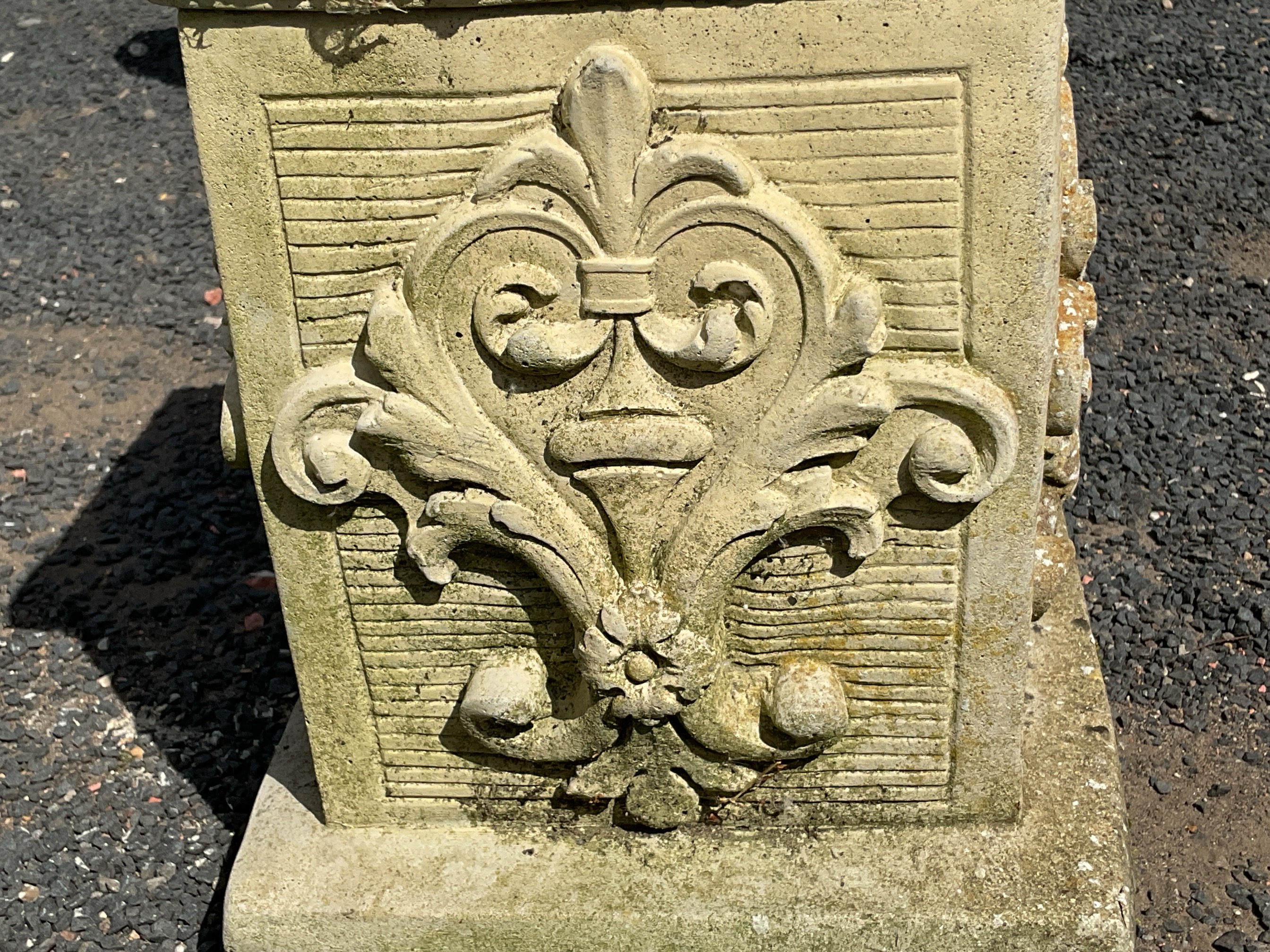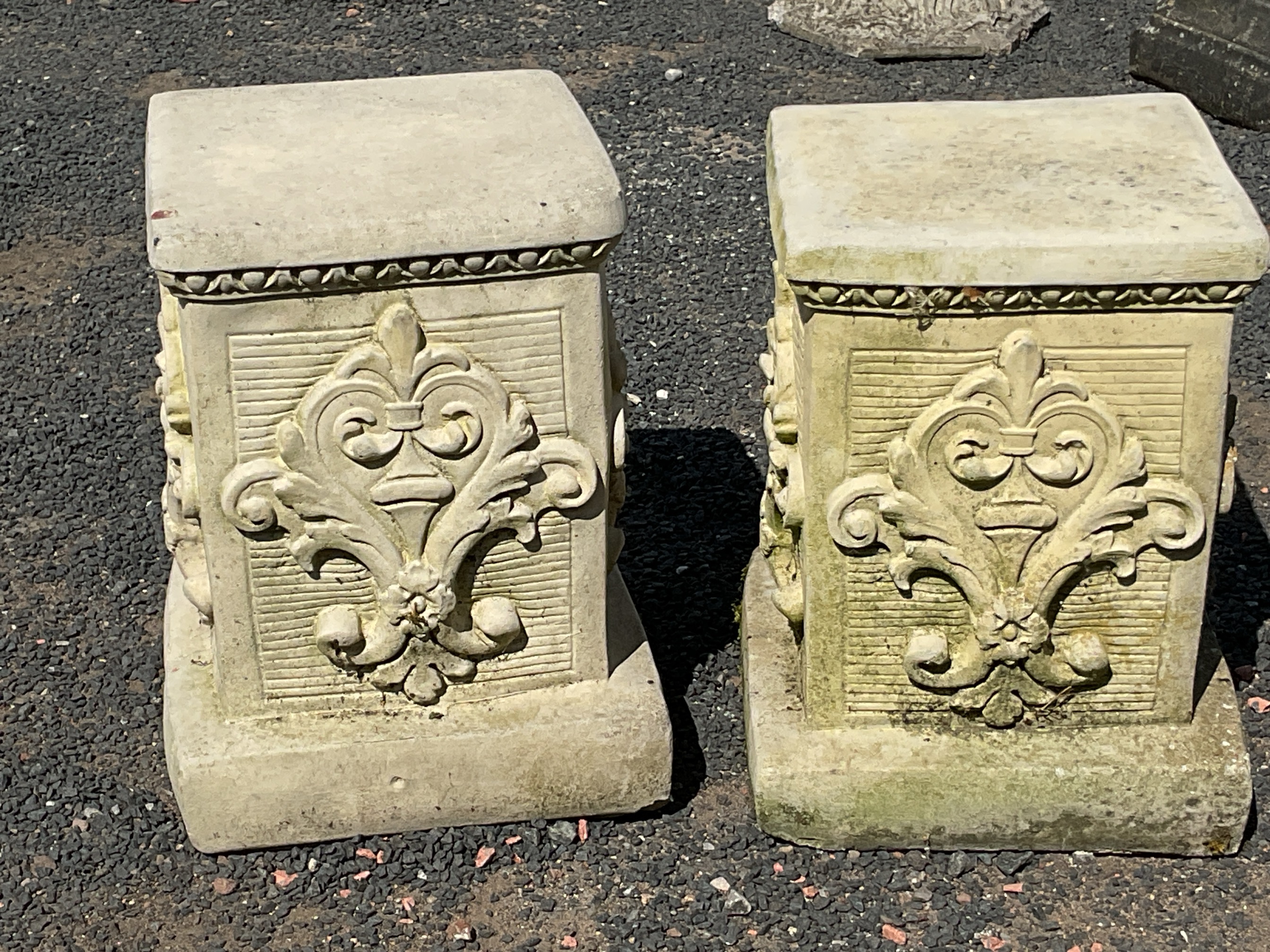 A pair of square composition stone columns, cast with scrolled shield style medallions to side panels, on plain plinths. (9in x 9in x 12in) (2)