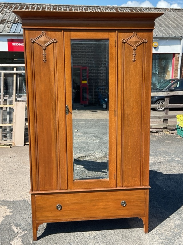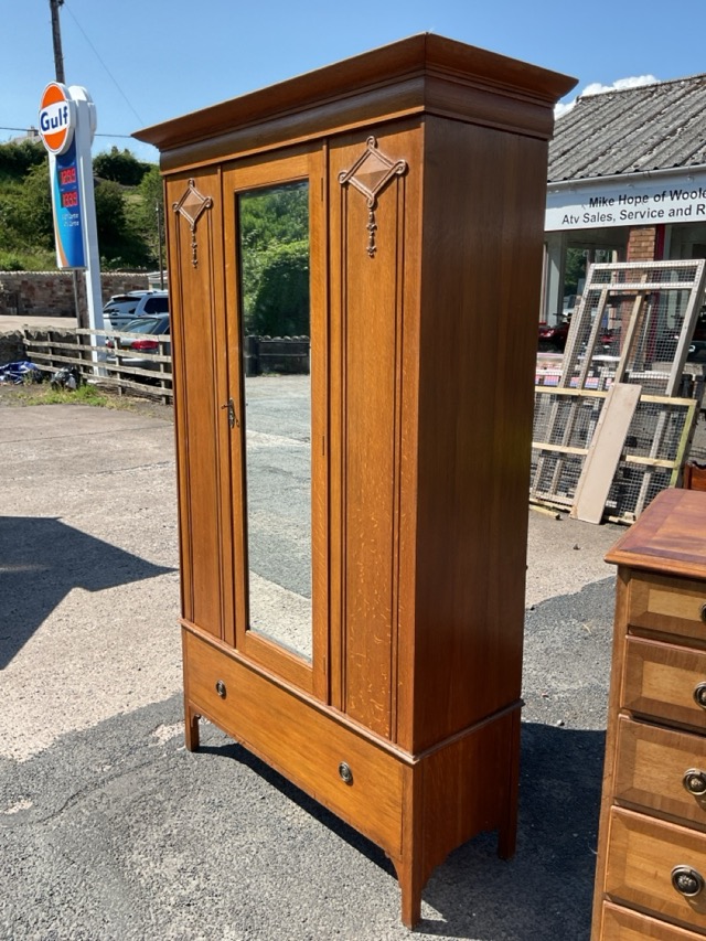 A late Victorian oak wardrobe by George Hobbs of Newcastle, with moulded cornice above a central bevelled mirror door flanked by raised panels with applied scrolled carvings above pendants, the base with long drawer. (45in x 17.5in x 77.5in)