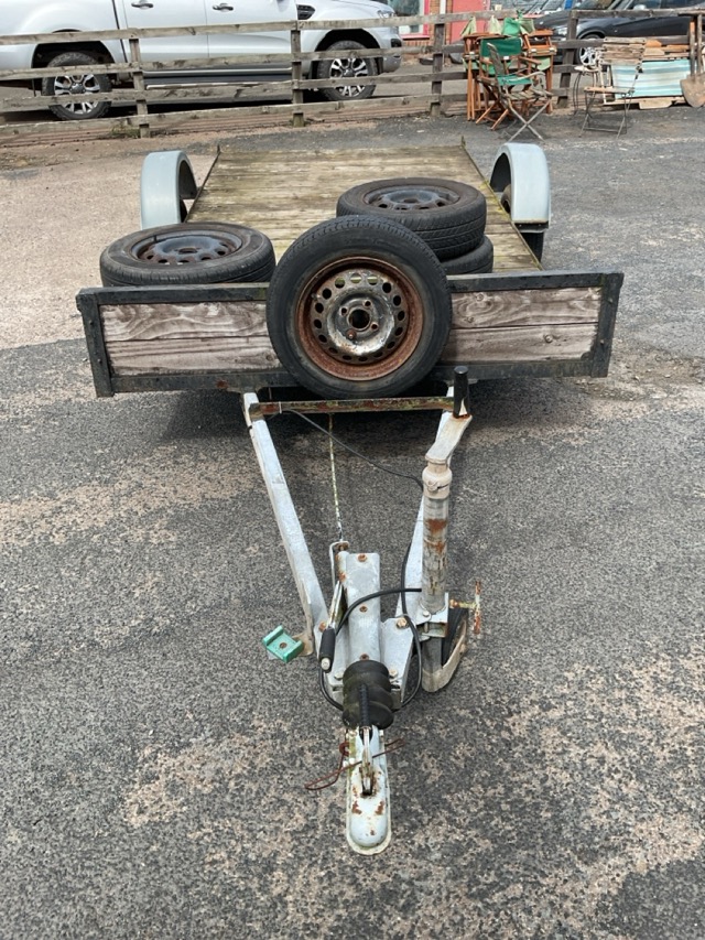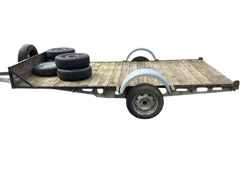 A large rectangular flatbed trailor with boarded platform on angleiron frame, complete with electrics, spare wheels, brakes, jack jockey wheel, etc. (128in x 63.5in)