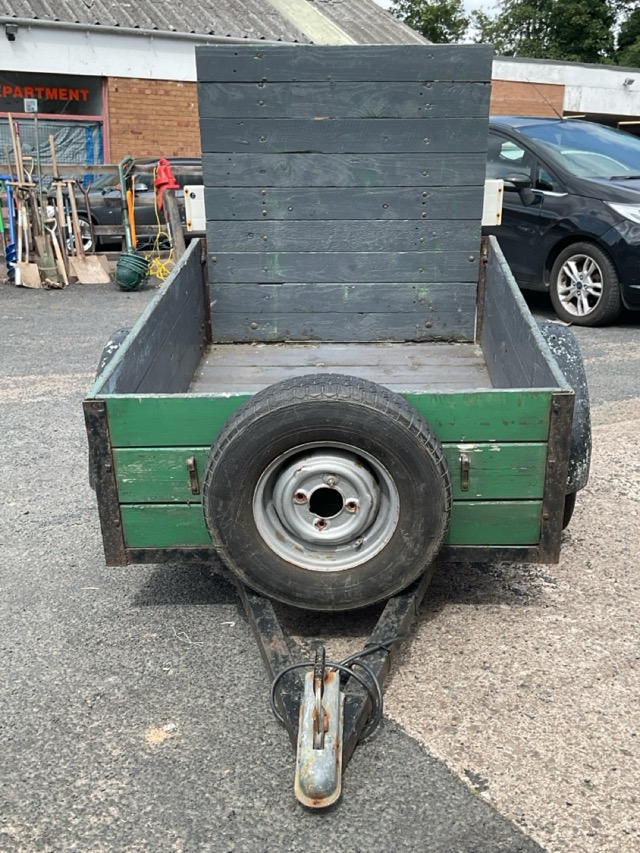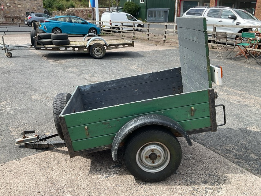 A rectangular box trailer of boarded construction on angleiron frame, the back with drop-down ramp, complete with spare tyre, electrics, mudguards, etc. (50in x 37.5in x 15.5in box)
