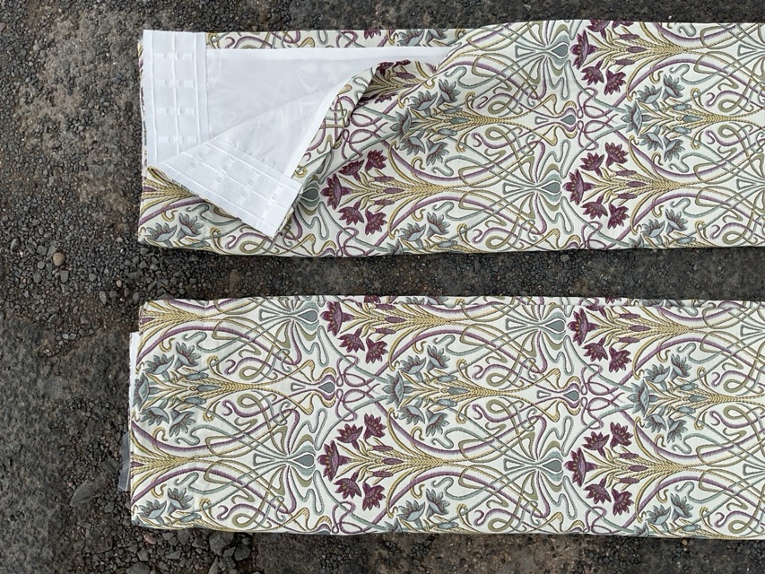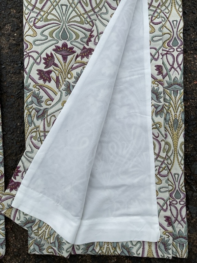 A pair of lined art nouveau style curtains, having stylised flowerhead sprays on a cream ground, with matching tie-backs. (90in) (2)