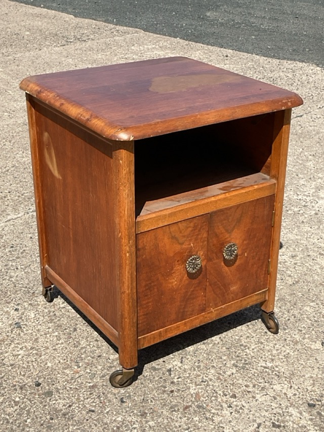 A 1950s walnut cabinet with square rounded top above an open compartment and cupboard with two doors, raised on casters. (20in x 20in x 24.75in)