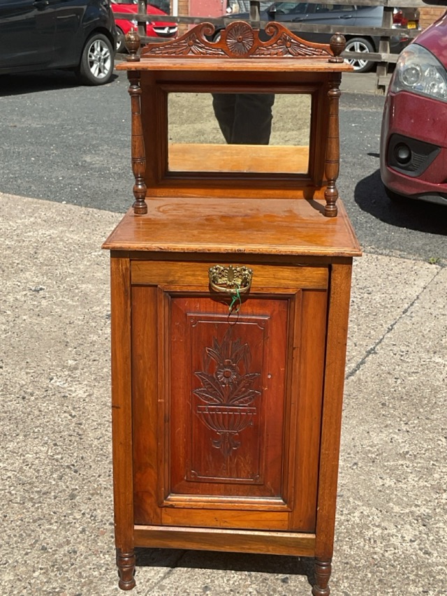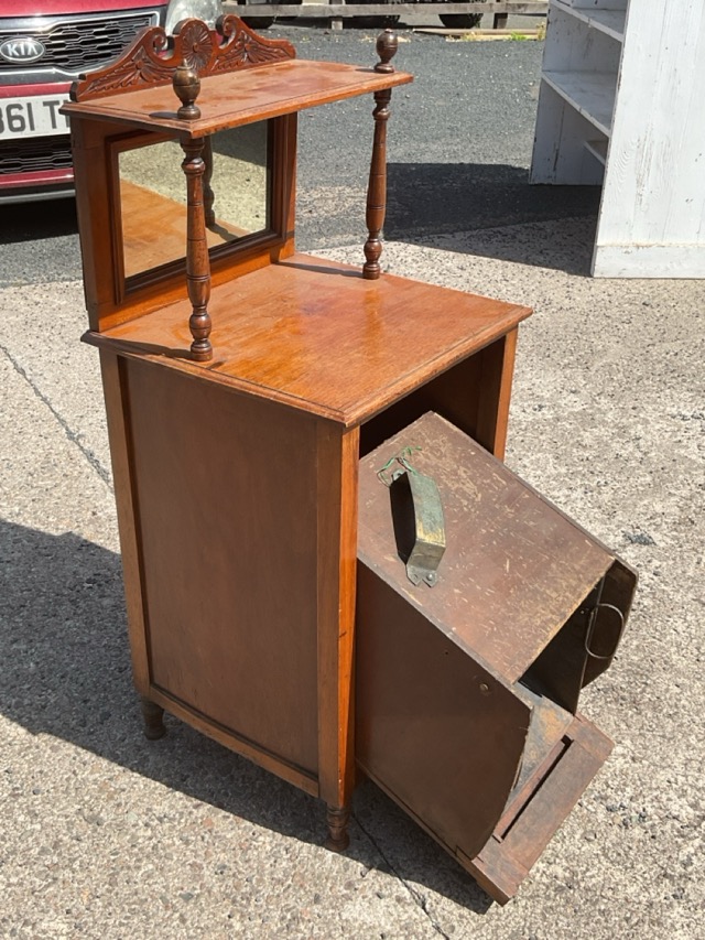 A Victorian walnut fireside cabinet with carved pediment above a shelf supported on turned columns with mirror back, the base with carved hinged compartment having lined interior, raised on turned legs. (14.5in x 14.2in x 34.5in)