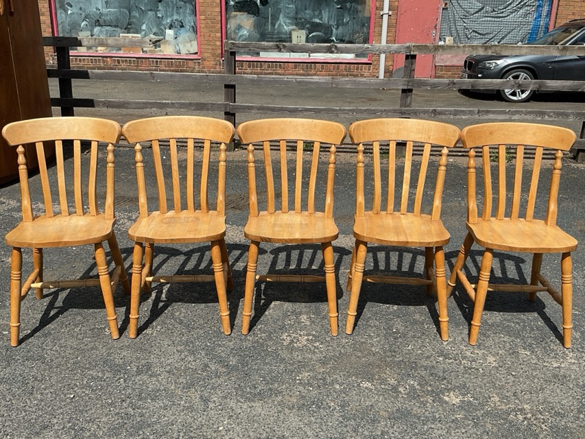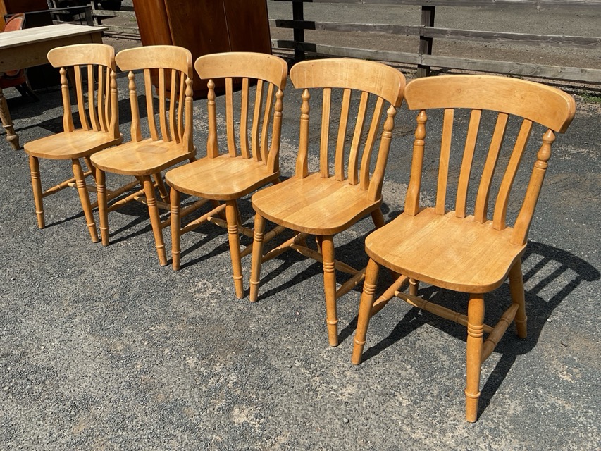 A set of five slatback kitchen chairs with shaped backs and solid seats raised on turned legs & stretchers. (5)