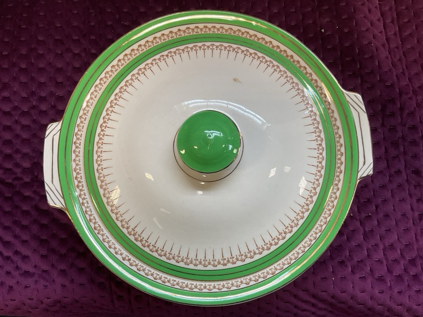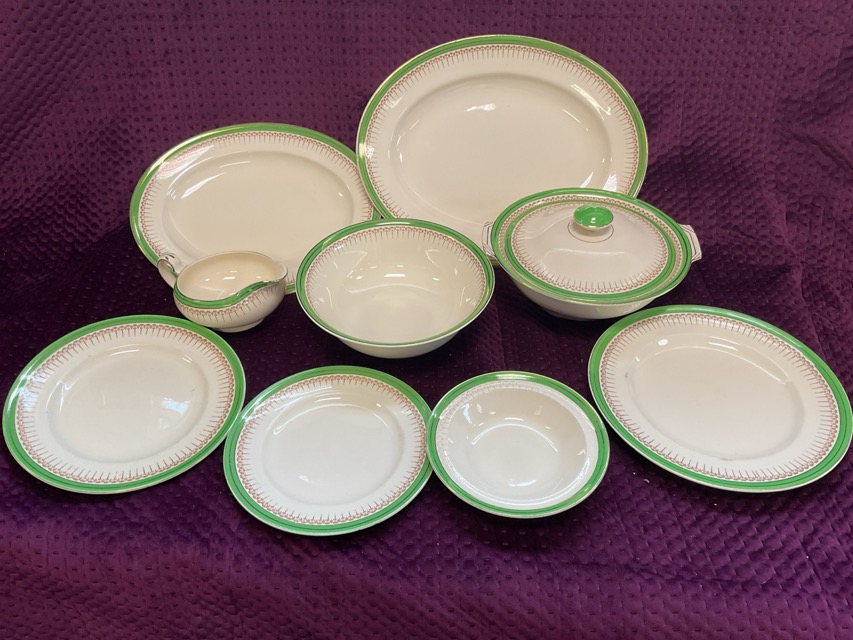 An Alfred Meakin dinner service with gilt & green borders - tureens & covers, gravy boats, ashets, bowls & plates, etc. (A lot)