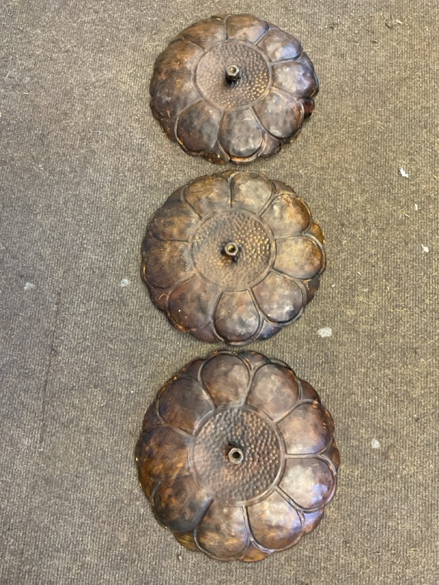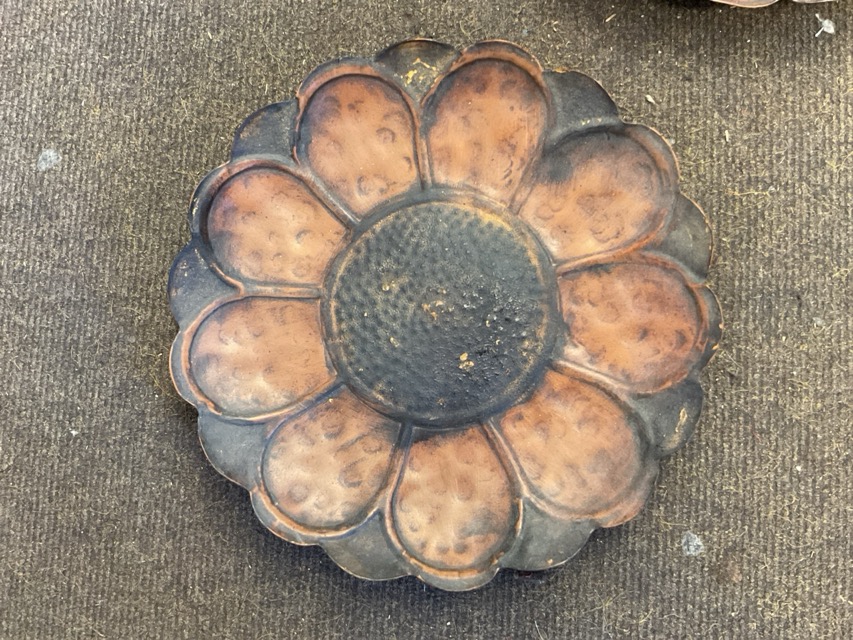 A set of three hand-beaten circular copper style platters in the form of sunflower heads. (9.25in) (3)