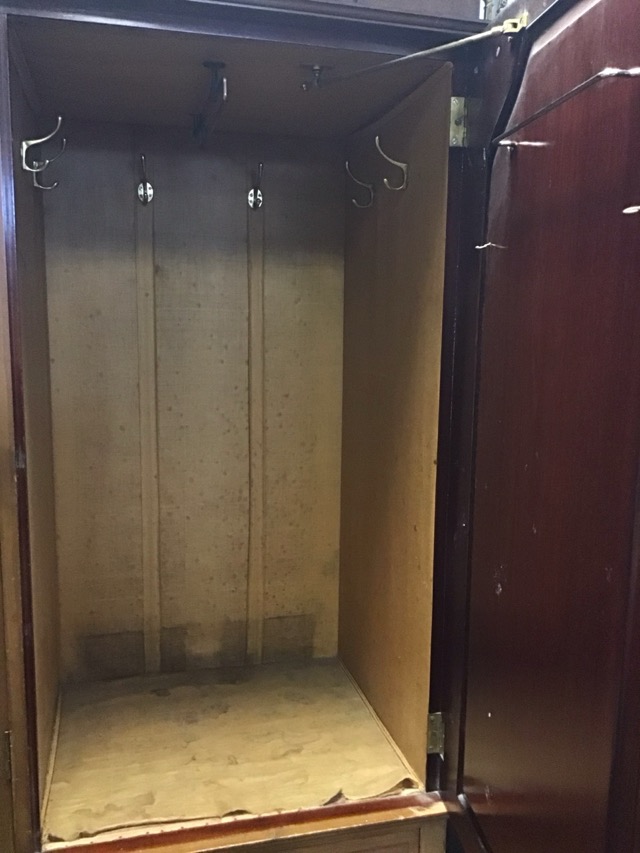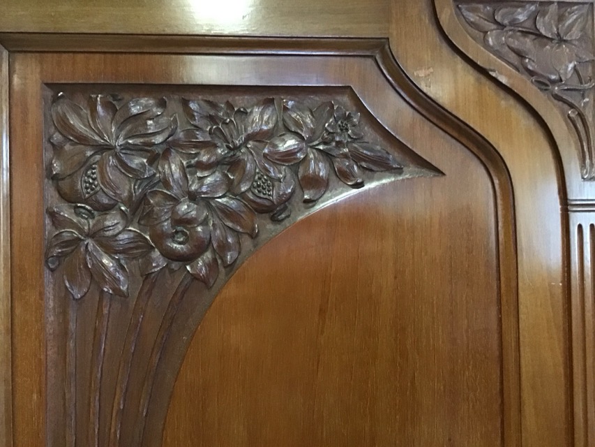 An Edwardian mahogany art nouveau wardrobe with moulded cornice above a central bevelled mirrored door flanked by panelled doors with sinuous carving of pomegranates and flowers, one side with three drawers, on a moulded shaped apron with bun feet. (79.5in x 25in x 87in)