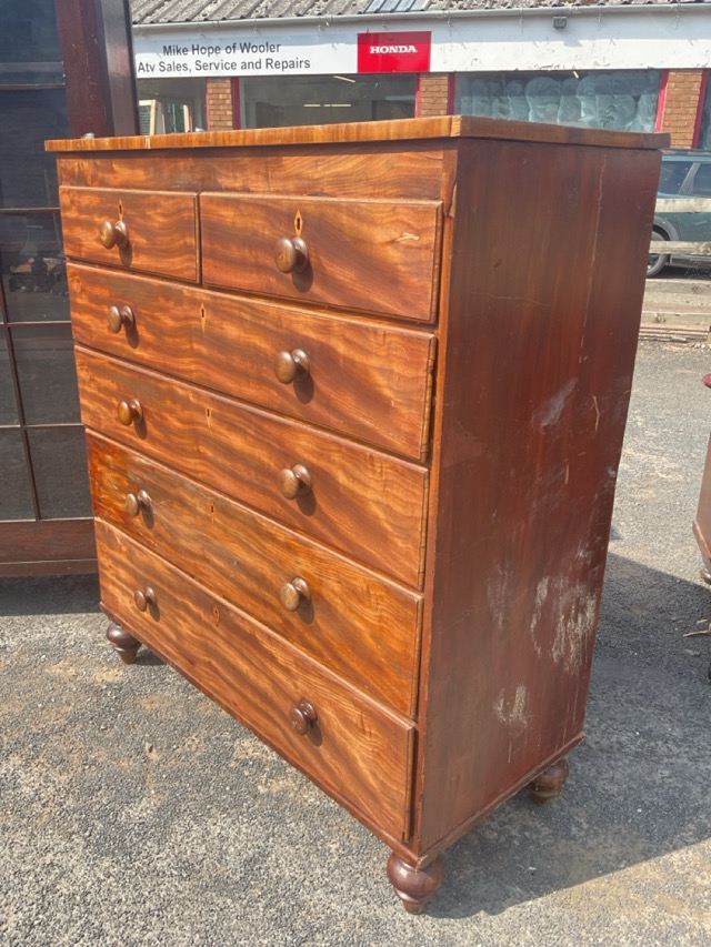 A Victorian mahogany chest of two short and five long knobbed drawers, raised on bun feet. (46.25in x 20in x 52in)