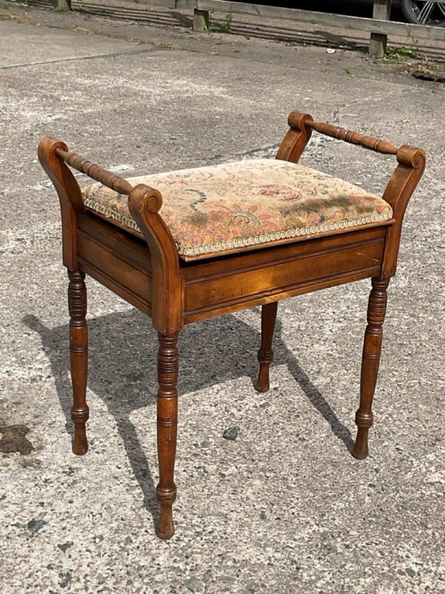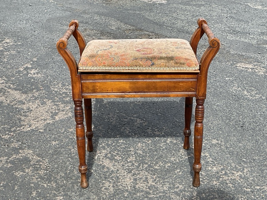 An Edwardian hardwood piano stool with upholstered hinged seat opening to a compartment, flanked by turned arms on scrolled supports, raised on turned legs.