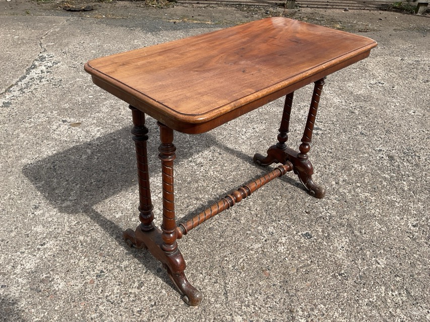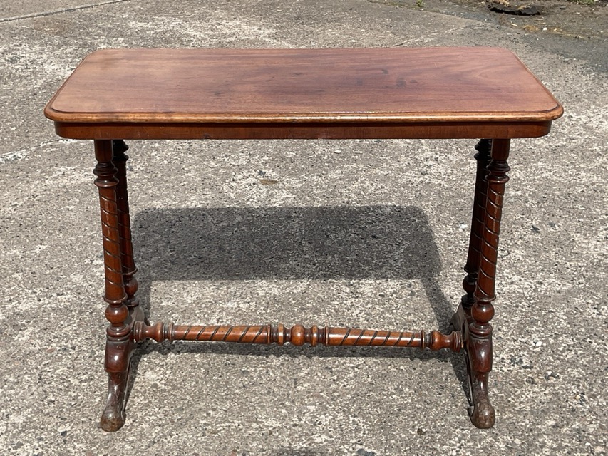 A Victorian mahogany occasional table with rectangular moulded top raised on turned and spiral grooved legs with cabriole feet joined by a conforming stretcher. (32in x 18in x 27.5in)
