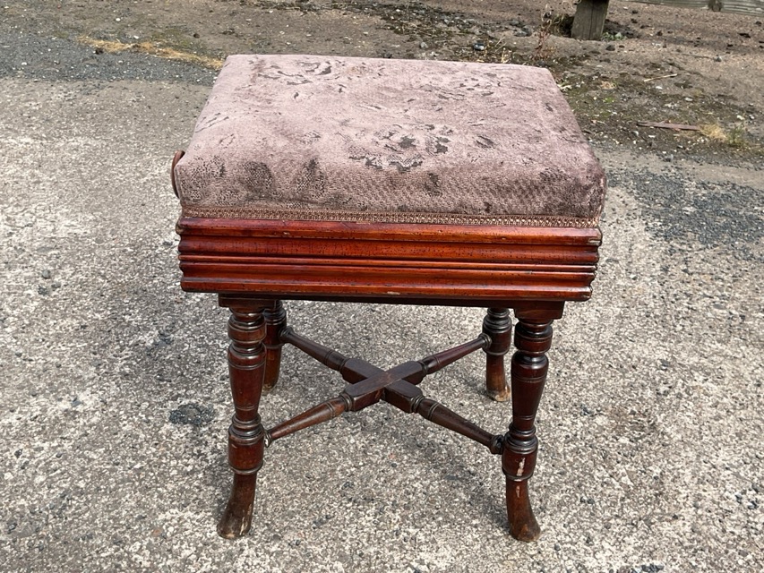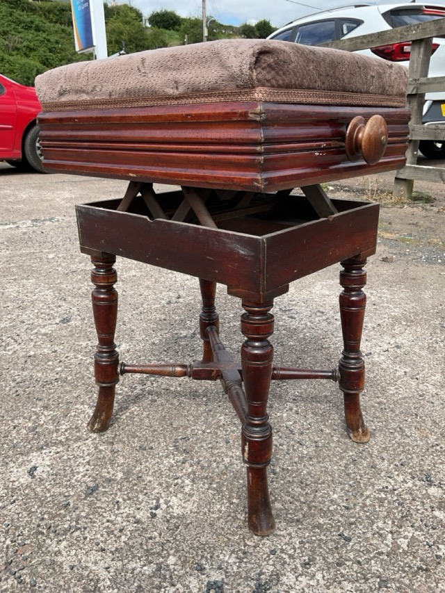 A Victorian mahogany adjustable stool with rectangular upholstered seat above moulded aprons, with knobs controlling rise-and-fall action, raised on turned legs with cross stretchers.