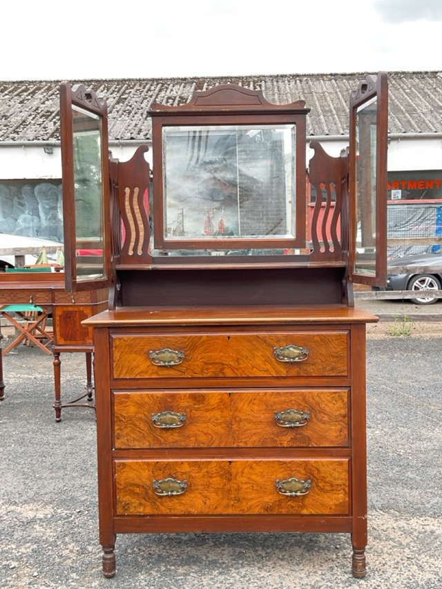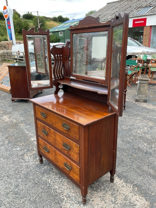 An Edwardian burr walnut mahogany dressing chest with central bevelled mirror tilting between pierced supports with conforming hinged wings, above a platform shelf and three brass handled drawers, raised on turned legs. (32in x 20in x 65.5in)