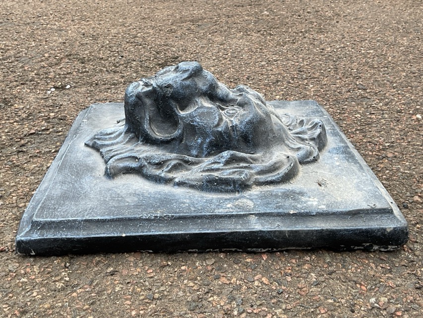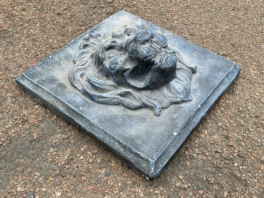 A square faux lead composition plaque cast in high relief with a lions mask. (11.5in x 11.5in)
