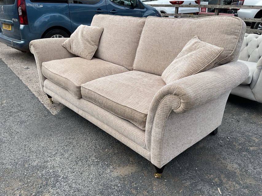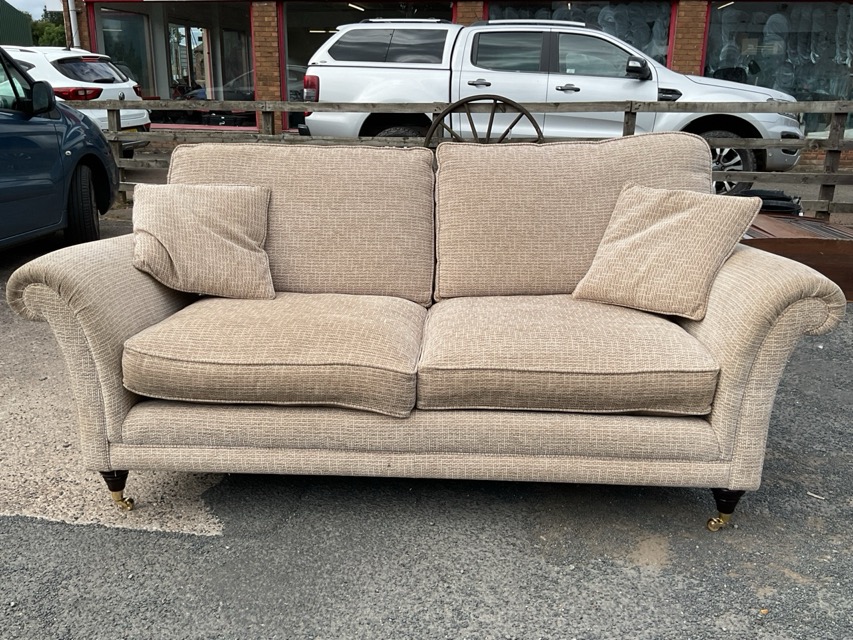 A Parker Knoll Edwardian style upholstered sofa with rectangular back and seat with loose cushions, flanked by outscrolled arms, raised on turned mahogany legs with brass castors. (81in)