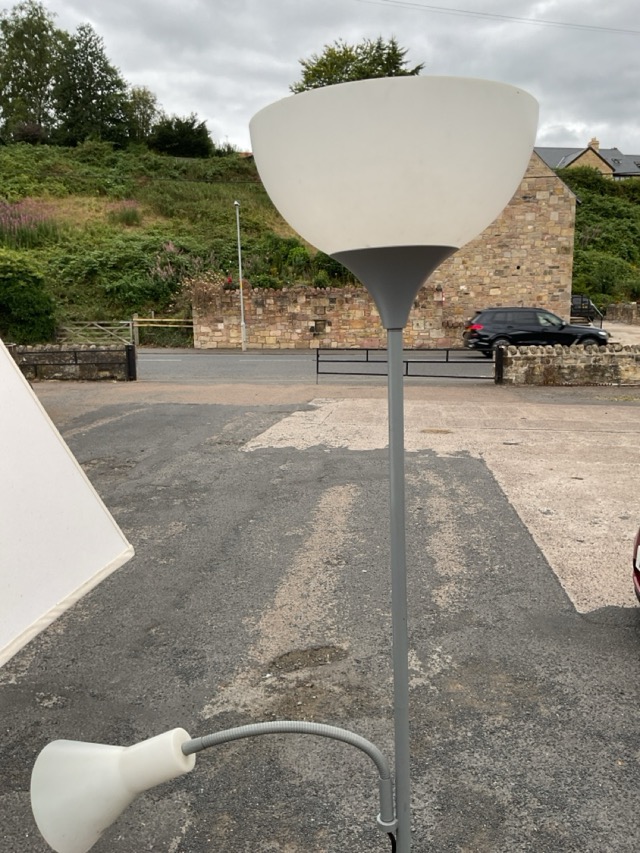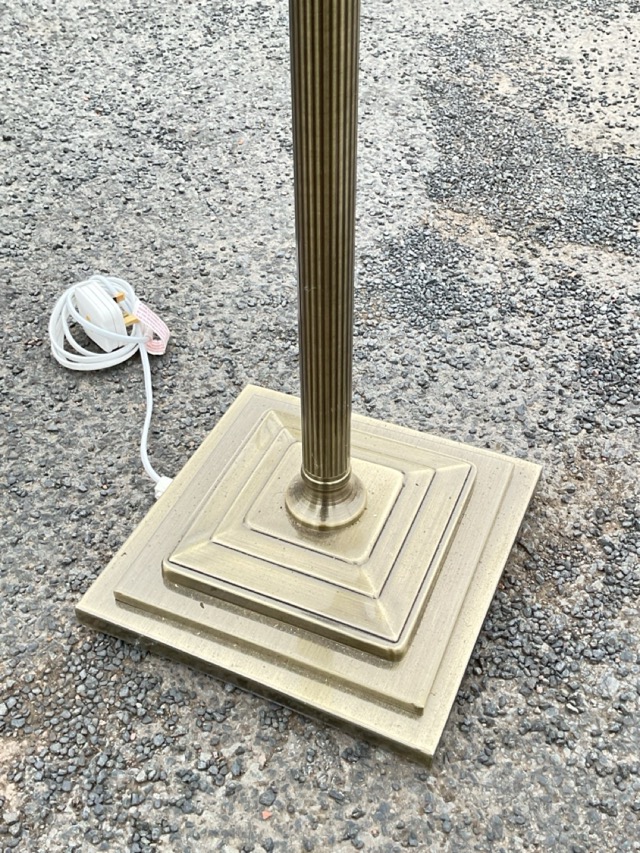 A brass standard lamp with reeded column on a weighted square stepped base with pyramidal shade; and a contemporary uplighter standard lamp with bowl shade on a tubular column having adjustable subsidiary reading light, on a circular weighted base. (2)