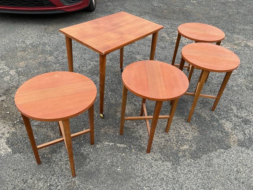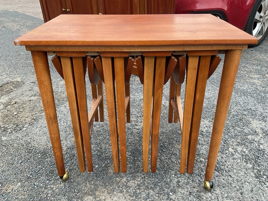 A 70s mahogany nest of tables, the main rectangular piece on tapering cylindrical legs with castors, holding four circular drop-leaf tables. (5)
