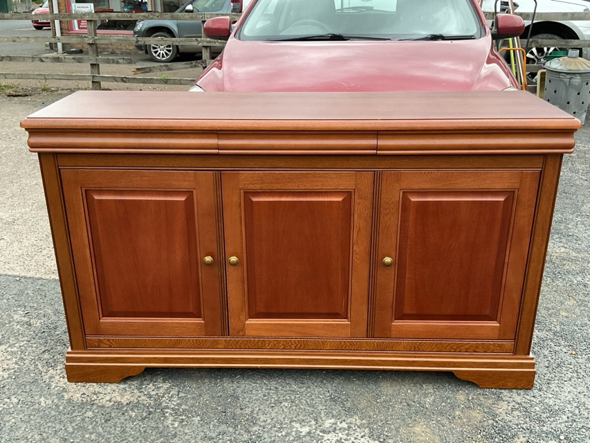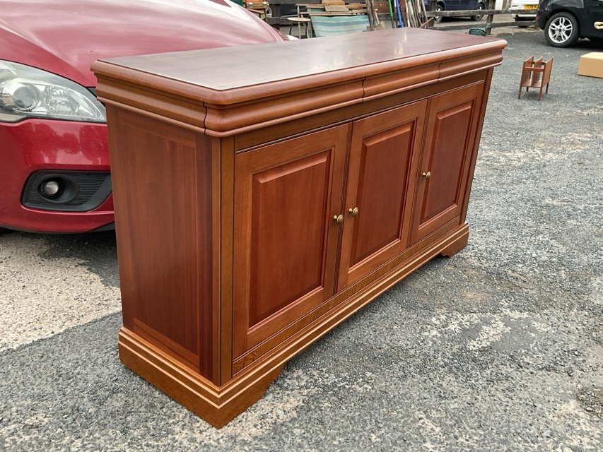 A Louis-Philippe style mahogany sideboard with rectangular moulded crossbanded top above three frieze drawers and three brass knobbed fielded panelled doors, raised on bracket feet. (58in x 16.5in x 34in)