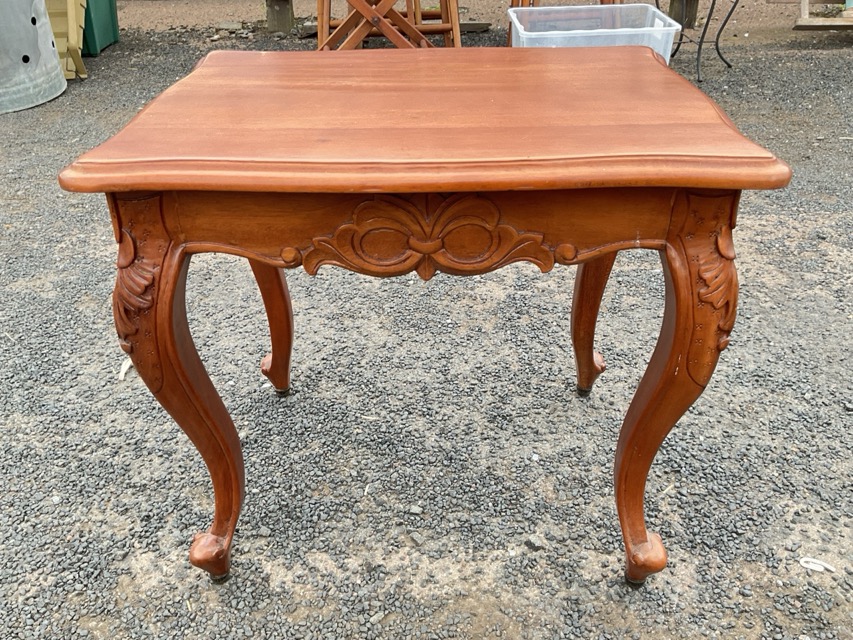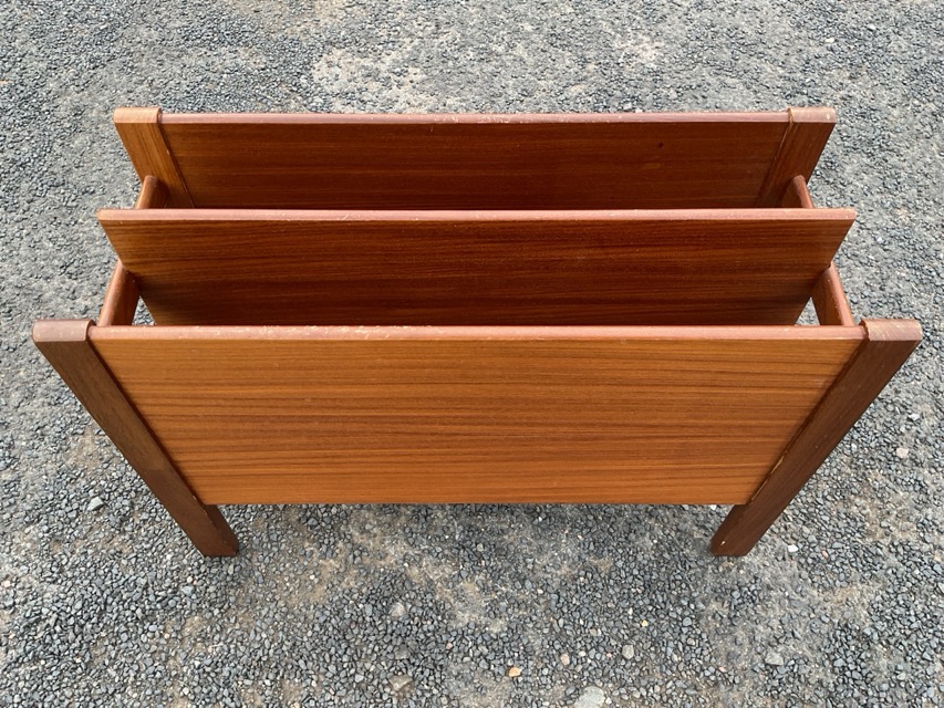 A rectangular mahogany scalloped top coffee table with scroll carved aprons raised on cabriole legs; and a 70s teak magazine rack with two divisions. (2)