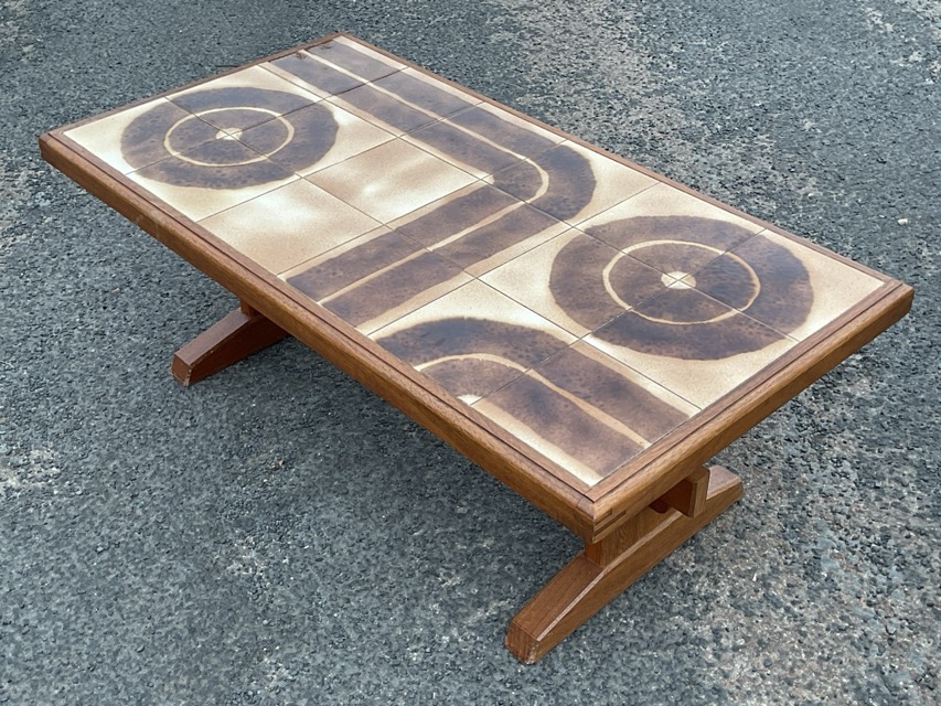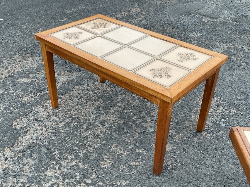 A 60s tile top mahogany coffee table with moulded frame on rectangular supports joined by pegged stretcher; and another with tiled top on square tapering legs. (37.5in & 27.25in) (2)