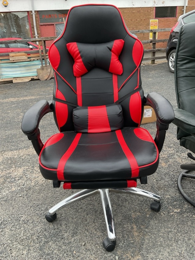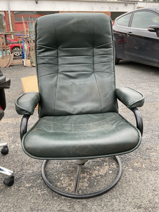 An upholstered desk armchair with adjustable shaped back and rectangular seat flanked by padded arms on an adjustable five-legged chromed swivel base with castors; and another with rectangular back and seat on a circular tubular swivel base. (2)