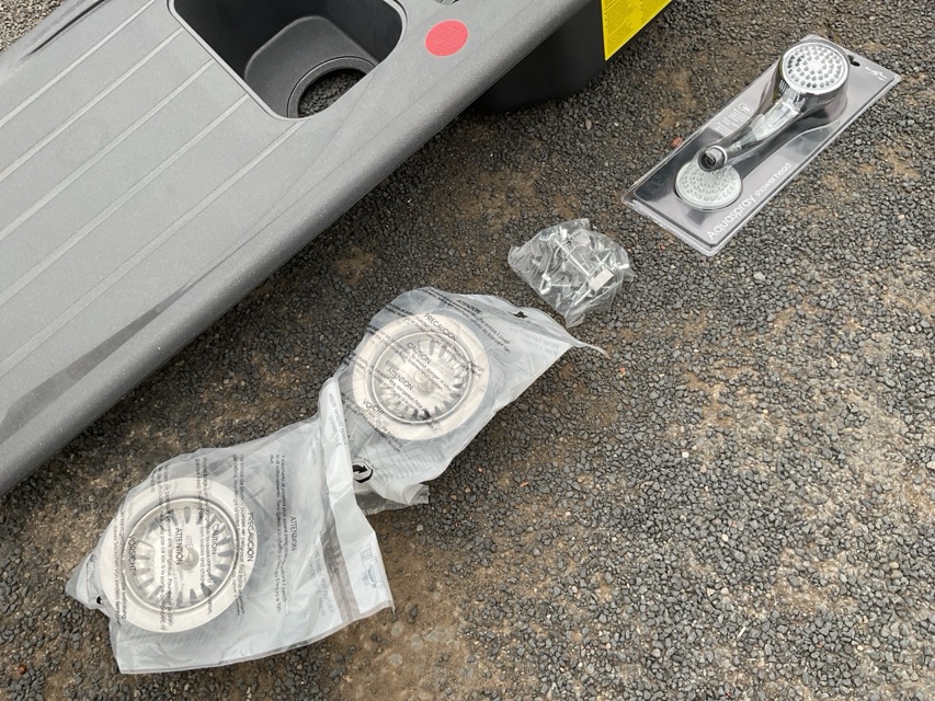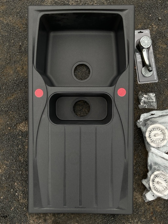 A boxed new and unused graphite sink with large and small bowls, grooved draining board and chromed plugholes; and a cased Aquaspray shower head. (38in x 20in) (2)
