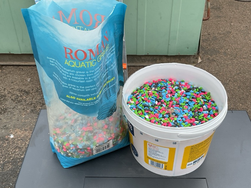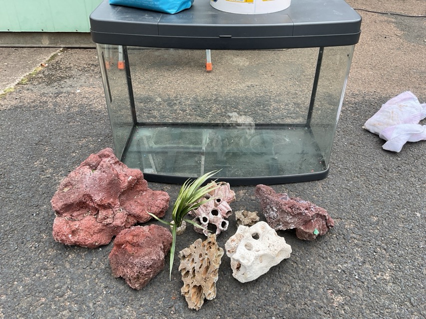 A bowfronted glass aquarium tank complete with rocks & gravel, having hinged illuminated cover. (23.5in)