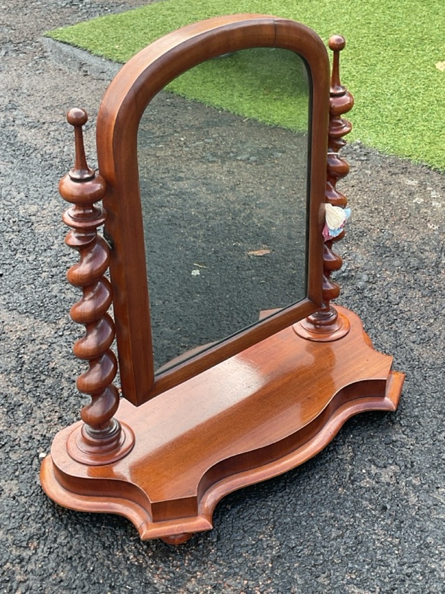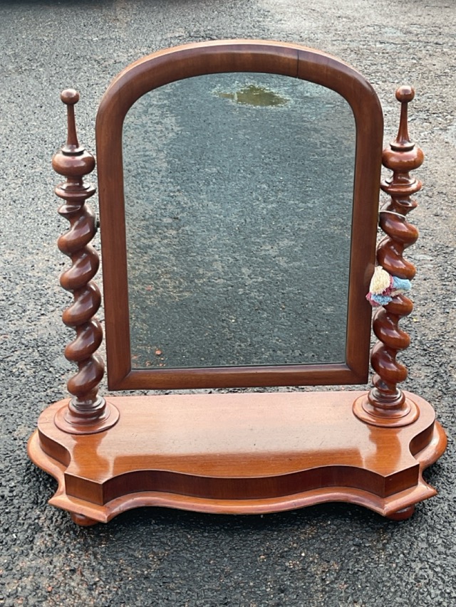 A Victorian mahogany dressing table mirror with arched plate tilting between barleytwist supports with turned pointed finials, on a serpentine shaped base raised on bun feet. (23in x 10in x 23in)
