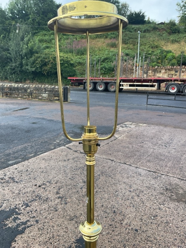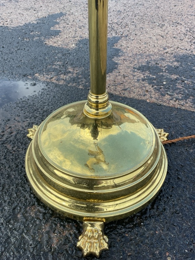 An Edwardian style brass standard lamp with knopped column on a circular weighted domed moulded base, raised on lions paw feet, with waisted fabric shade. (66in)