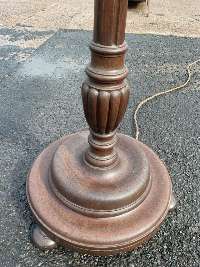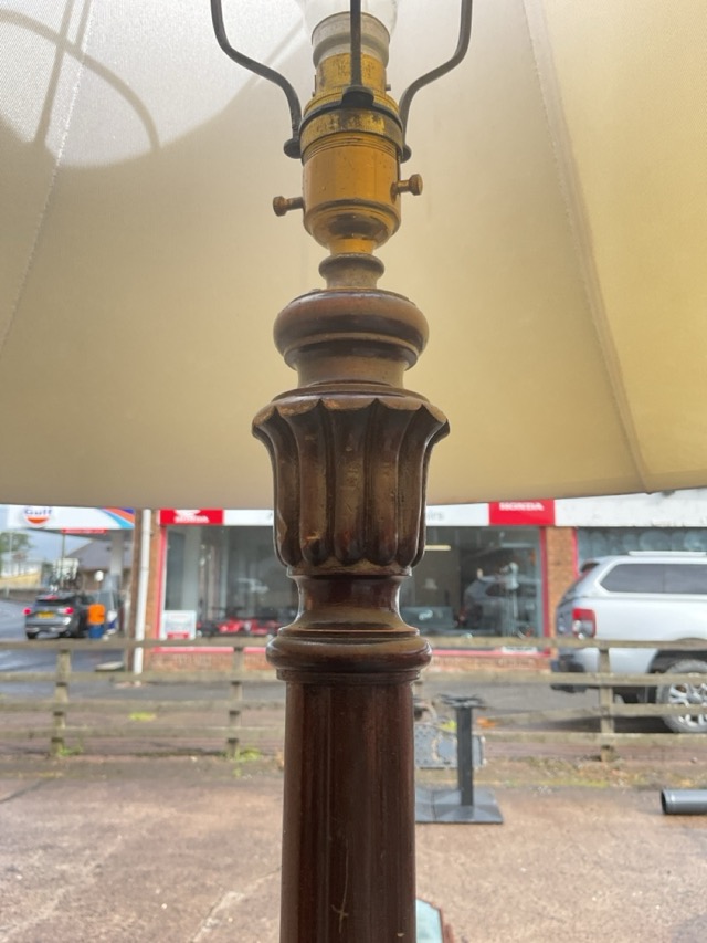 A mahogany standard lamp with turned fluted column on a moulded circular base, raised on bun feet, with flared silk shade. (73in)