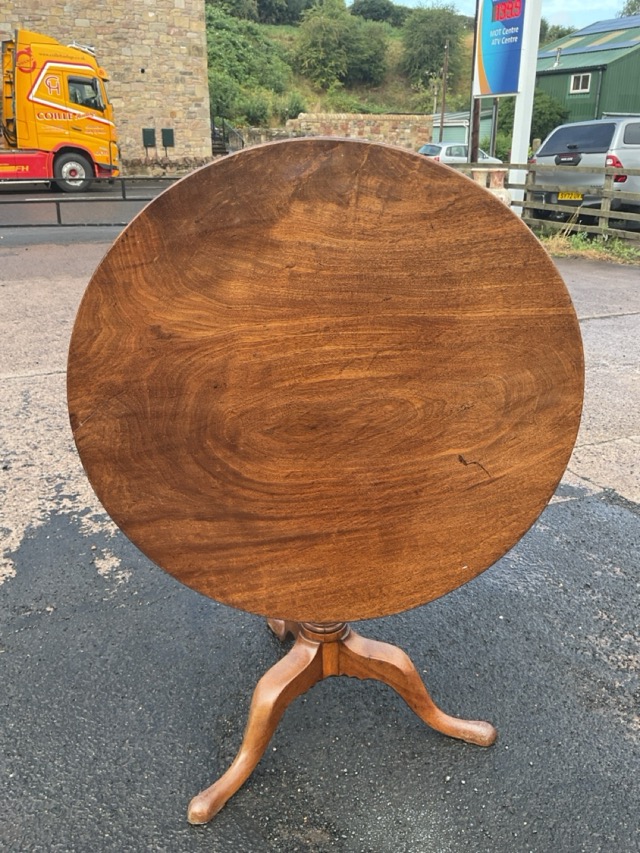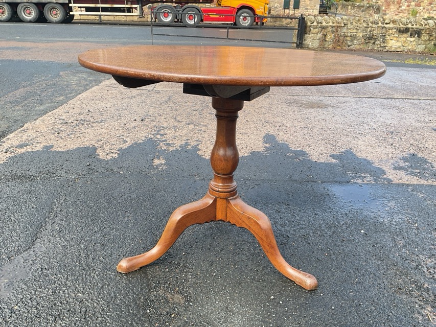 A Georgian mahogany circular tilt-top table with top on a box support and baluster turned column raised on cabriole legs. (36in x 36in x 28in)
