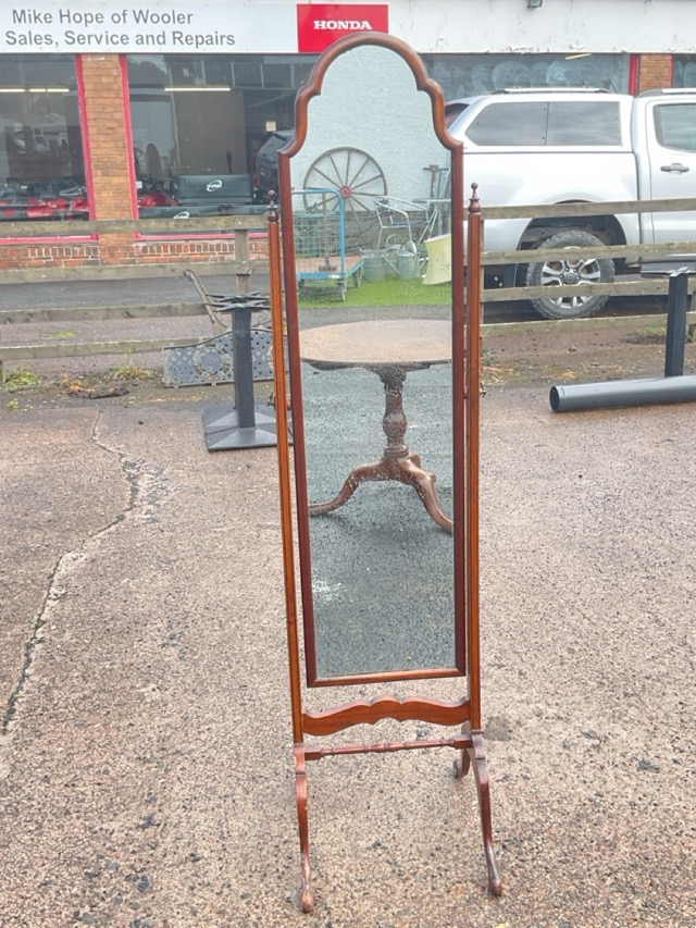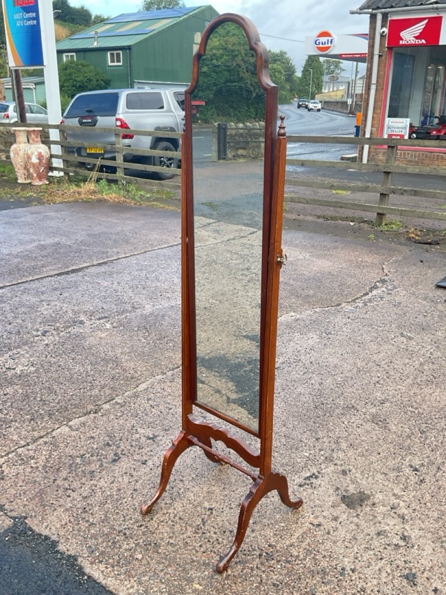 A Queen Anne style mahogany cheval mirror with ogee arched crest to plate tilting between grooved columns with turned finials, over a shaped rail, raised on cabriole legs joined by a turned stretcher. (63in)