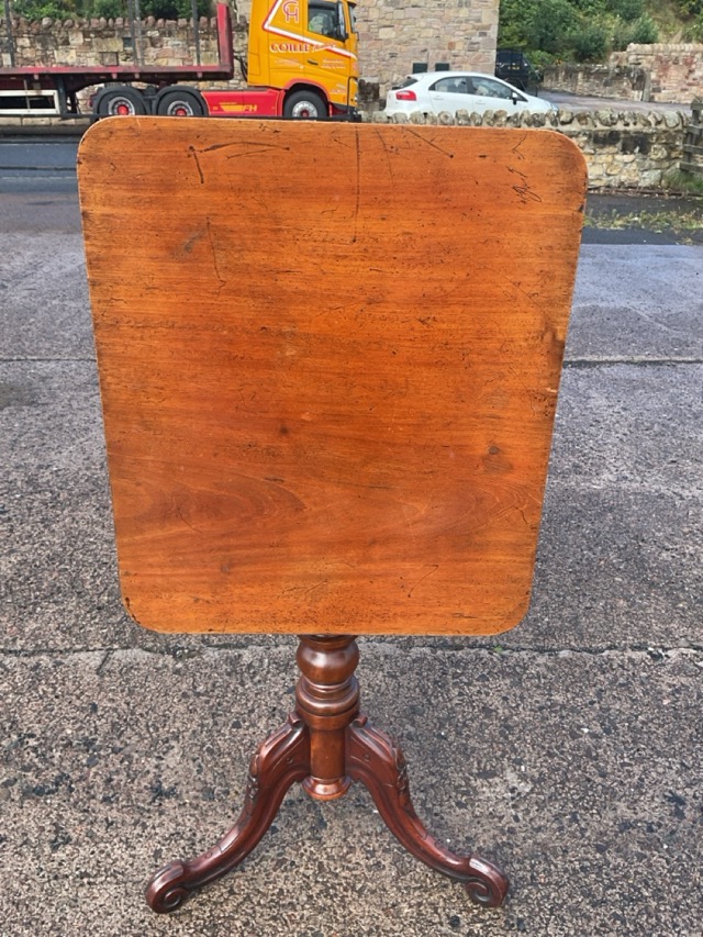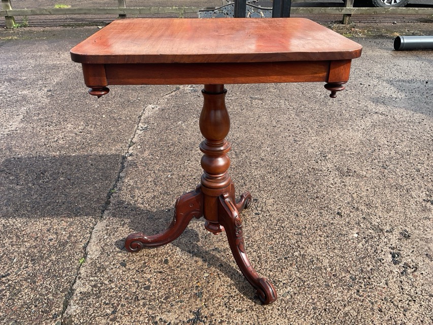 A Victorian mahogany snap-top occasional table with plain apron and drop finials, on a turned column with tripod base, and leaf carved cabriole legs.. (23.5in x 20in x 29in)