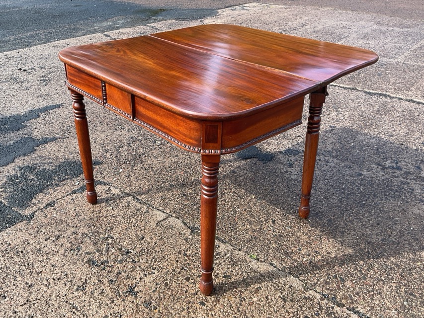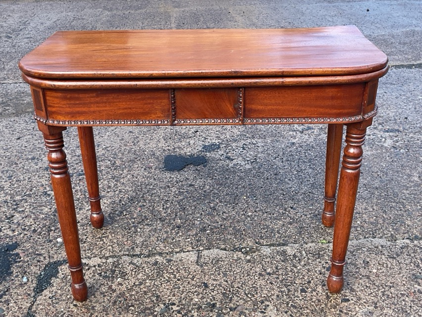 A George IV mahogany turnover top tea table opening on swing legs above a bobbin-turned moulded frieze with conforming central panel, raised on turned tapering legs. (35in x 35in x 27in)