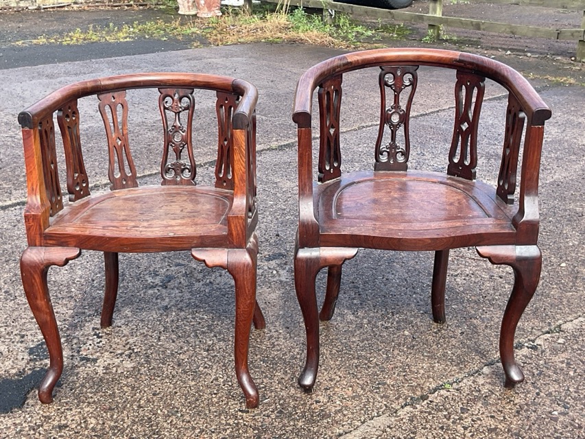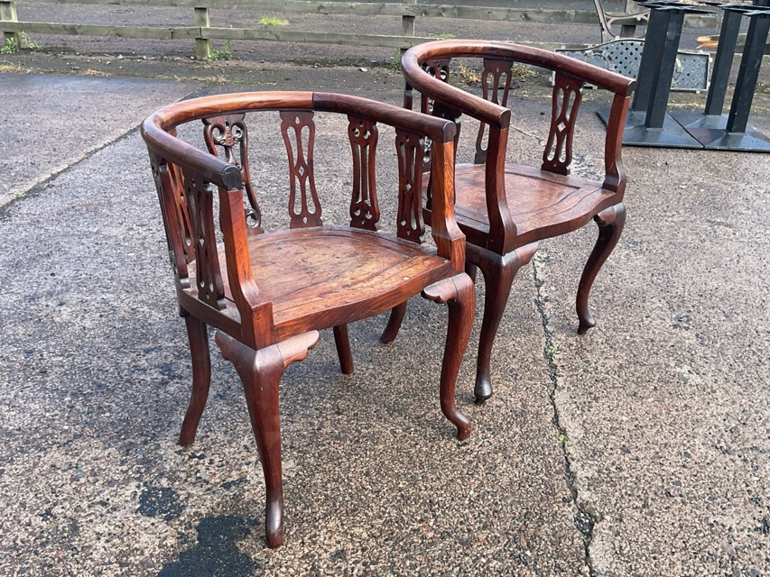 A pair of shaped rosewood captains style armchairs with horseshoe shaped arms above pierced carved splats and drop-in panelled seats raised on cabriole legs. (2)