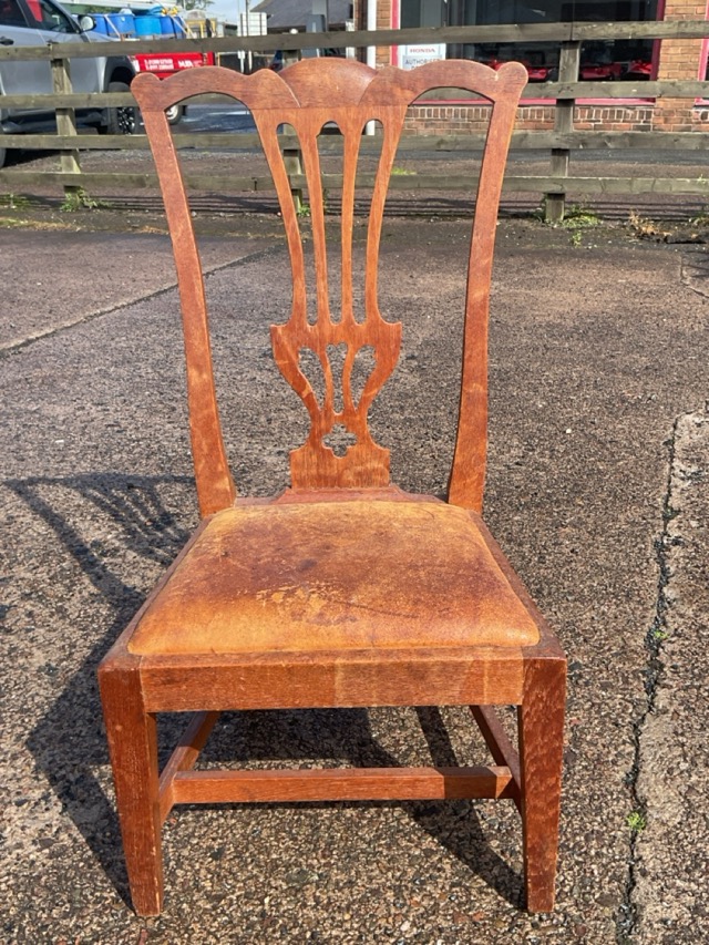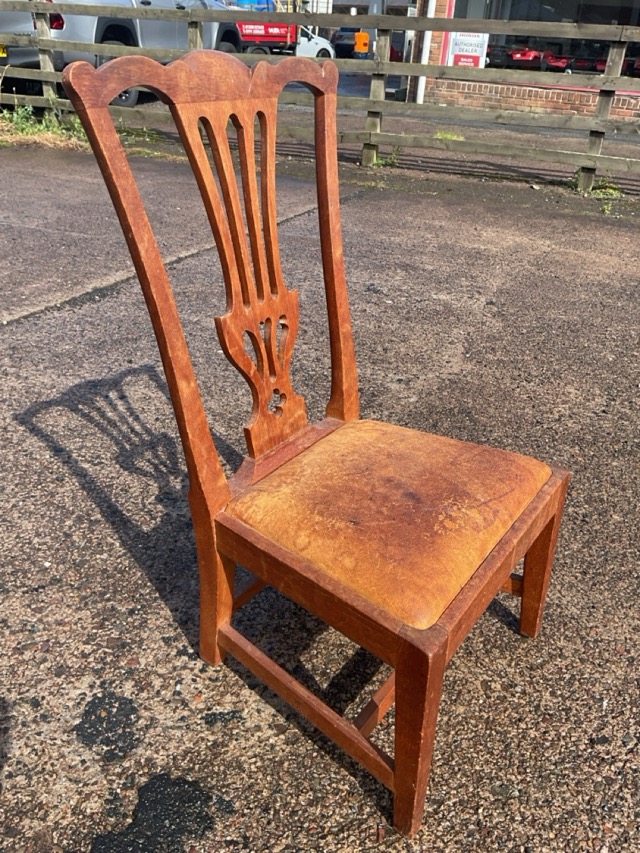 A Chippendale style elm gossip chair by Wheeler of Arncroach, with shaped back rail above a pierced splat, the leather drop-in upholstered seat raised on square tapering chamfered legs.
