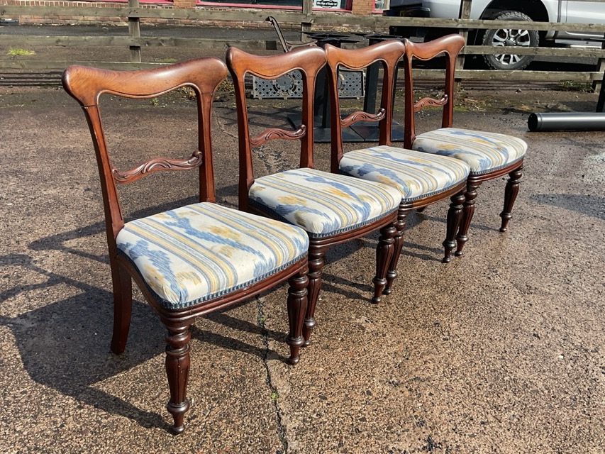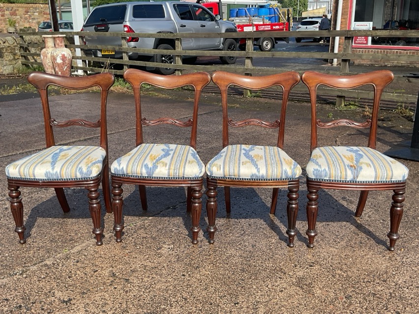 A set of four Victorian mahogany dining chairs with shaped backs and scroll carved rails above bowfronted upholstered seats in moulded rails, raised on turned tapering fluted legs. (4)