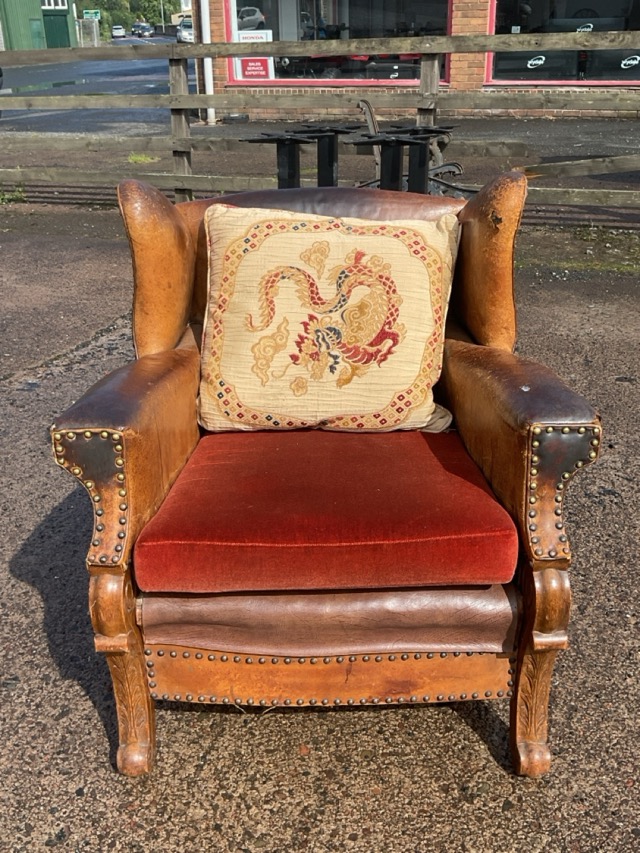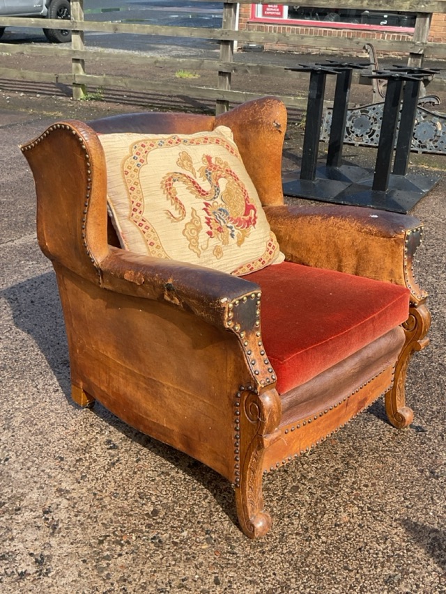 An Edwardian oak brass studded leather upholstered wing armchair with arched rectangular back and seat with loose velvet cushion, flanked by shaped serpentine wings and outscrolled arms, raised on acanthus scrolled carved legs.