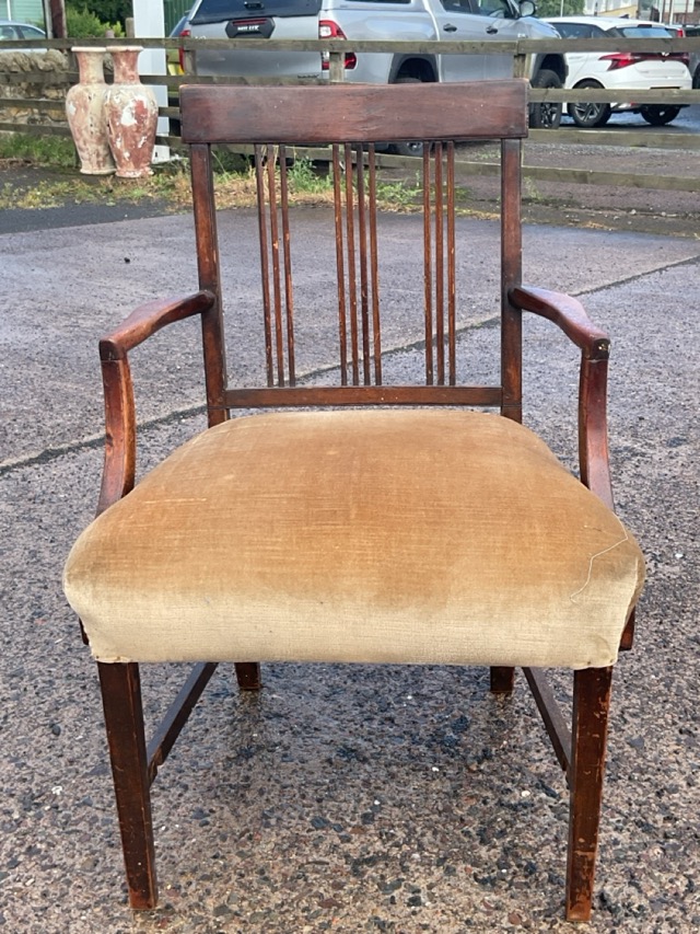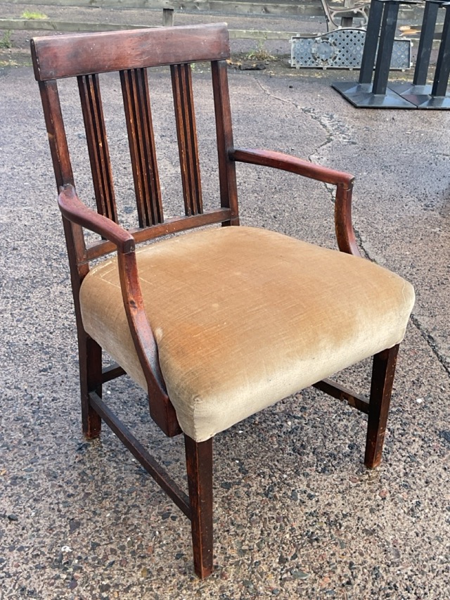 A Georgian mahogany armchair with tablet back and three slatted splats above a flared rectangular upholstered seat, flanked by curved arms, raised on tapering square legs joined by stretchers.