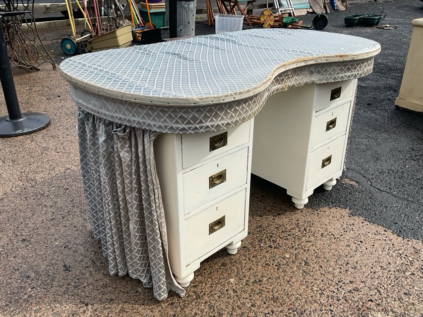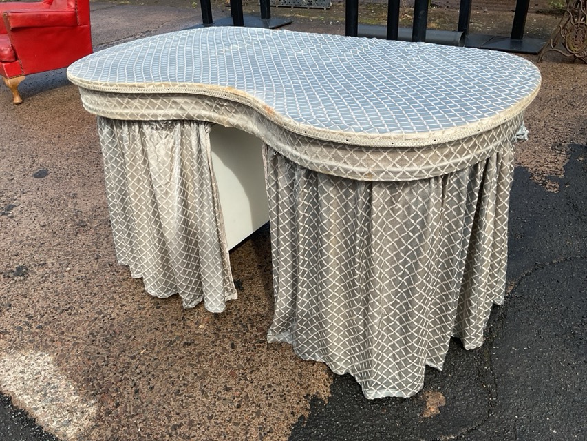A painted lidney shaped mahogany dressing table with brocade covered top and curtains enclosing twin pedestals, each with three brass campaign style handled drawers, raised on turned feet. (49.25in x 27.5in x 27.5in)