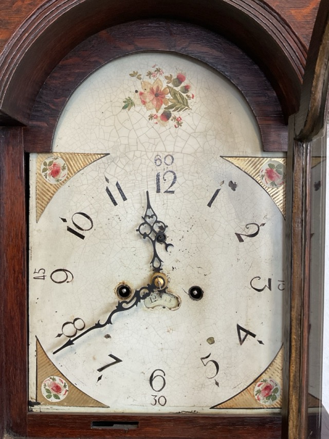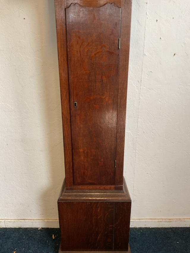 A C19th oak longcase clock with swan-neck pediment above an arched painted dial with arabic chapter ring and floral spandrels flanked by turned columns, above a trunk with shaped door and moulded base on a plinth. (82.25in)