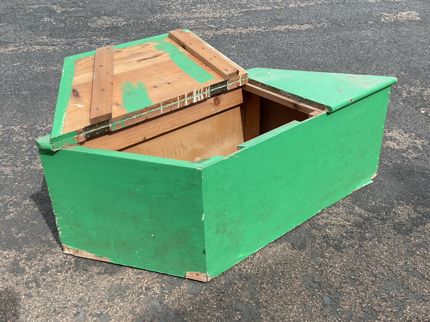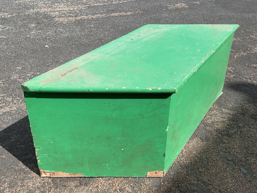 A painted pine rhomboid box with hinged lid enclosing compartment. (47in x 17in x 16.5in)