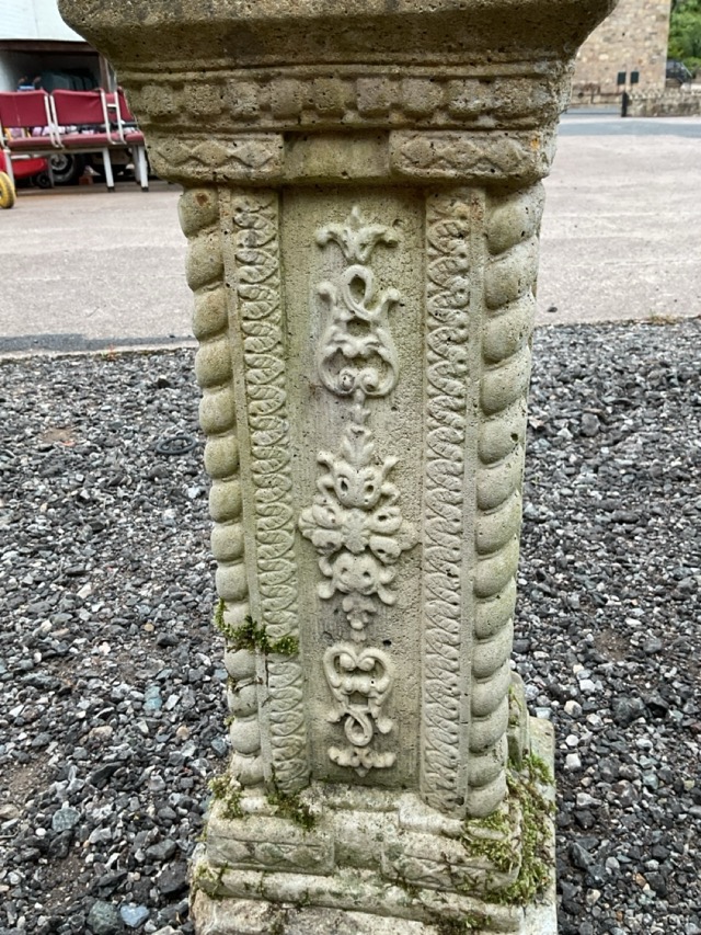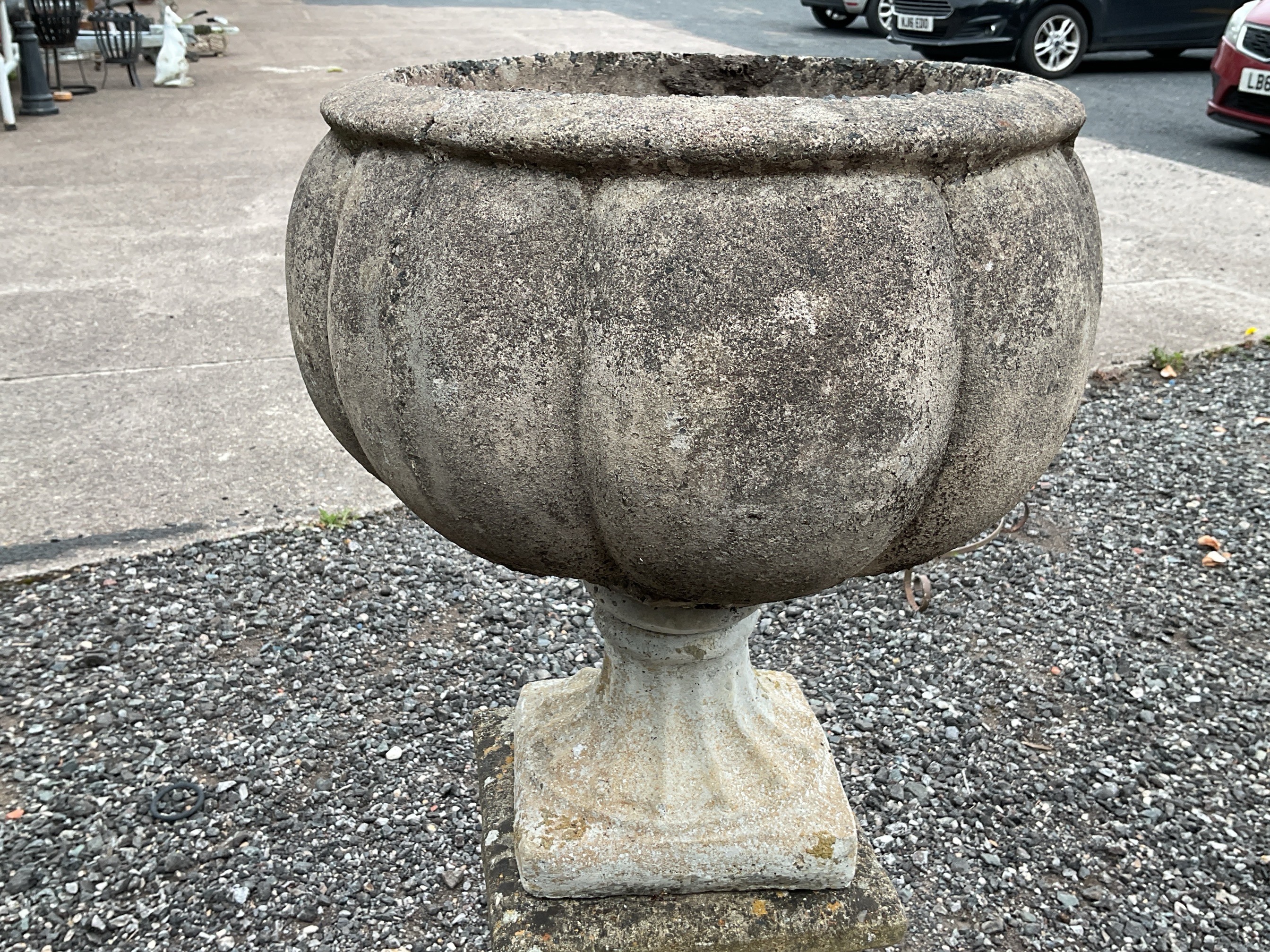 A composition stone urn on an associated stand, the fluted bowl on square plinth, the column support with stylised scrolled panels framed by ropetwist borders, on square moulded base. (40.25in)